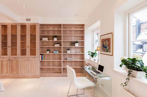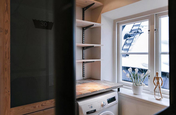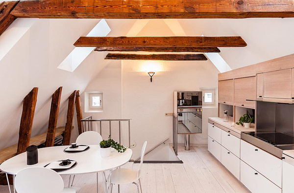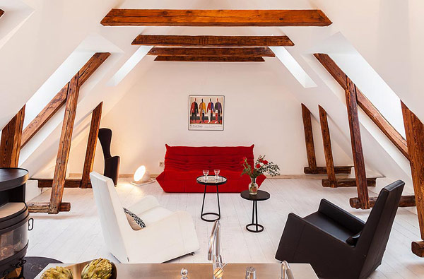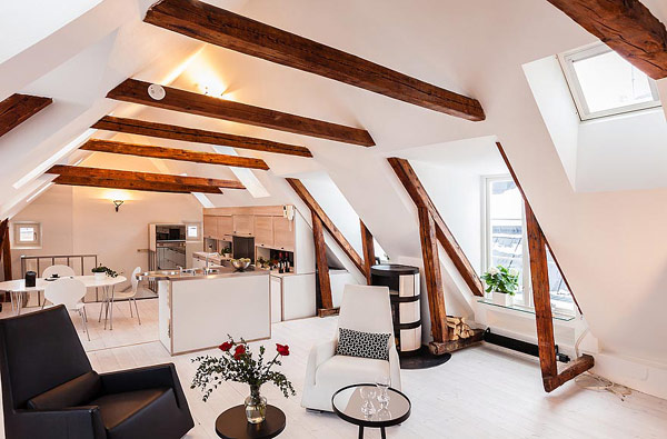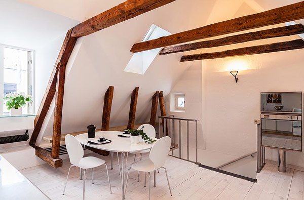 Този красив скандинавски дуплкес е с обща площ от 122 кв и има три стаи. На първия етаж има голям коридор, които води до спалнята както и голямо място за съхранение на дрехи и обувки. Има само една баня в цялото жилище и тя е на първия етаж. Класически стълби водят към страхотния втори етаж където дървените греди създават уютна атмосфера. Тук има всекидневна с отворен и трапезария – свеж и светъл интериор изпълнен с натурална светлина. Както в повечето скандинавски домове стените са боядисан в бяло като по този начин се създава силен контраст с дървените греди и червения диван.