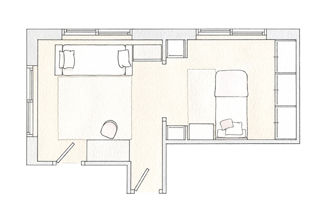 Голямото, изпълнено със светлина пространство е условно разделено на две зони: действителната спалня с двойно легло и зона за игра с маса и малък диван. И има много пространство за съхранение. Това не е сладникавата кукленска розова стая за момиче, а отлично решение за дете или тийнейджър.