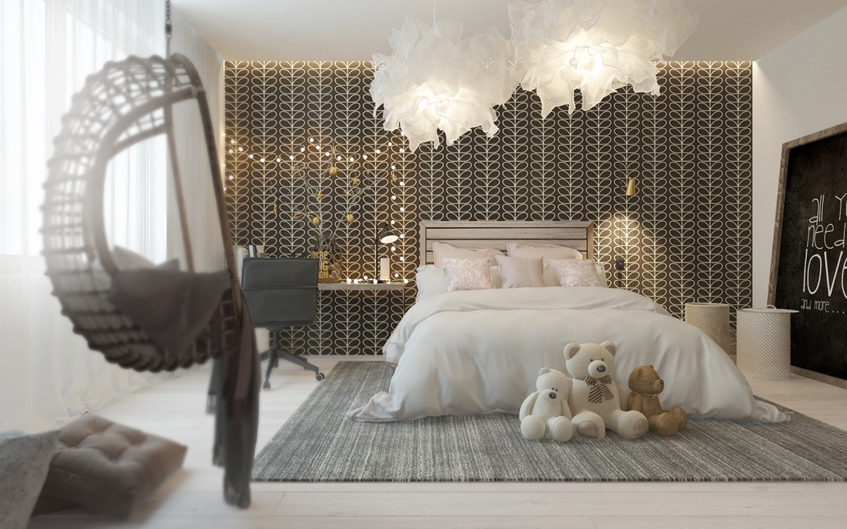 Какъв невероятен люлеещ се стол! Чудесно място да се отпуснете и да се насладите на една книга, след дълъг ден в училище. Говорейки за училище, малкото бюро монтирано на стената, помага да се спести място и осигурява практическо място за учене, рисуване. Светлините могат да бъдат коригирани, за да се съсредоточите в нощно четене. Вдъхновяващи фрази като „всичко, от което се нуждаем е любов“ помагат за постигането на позитивна атмосфера в спалнята.