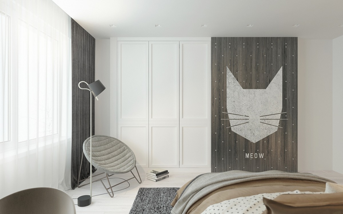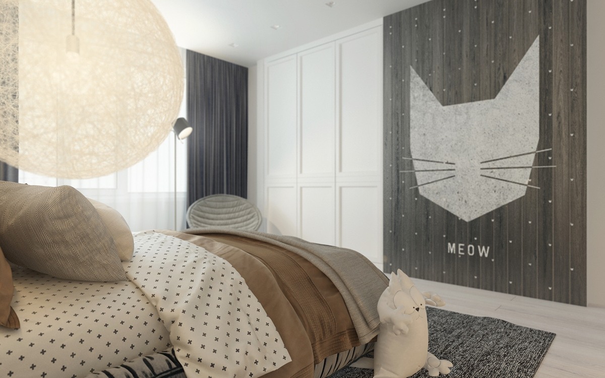 Нека погледнем в другата спалня, проектирана с едно младо момче. Спалнята е толкова семпла, колкото лъскава е предишната стая, но това пространство има забавна тема с животно – по-подходяща за по-малки деца. Посетителите веднага забелязват две основни функции: геометрични тапети в ляво и минималистична котка с фон на точки отдясно. Това е забавно пространство, готово за приключения и игра. И вижте тези забавни осветителни елементи! Бюрото е супер минималистично, с възможност за много съхранение в комбинация с хубав стилен стол.