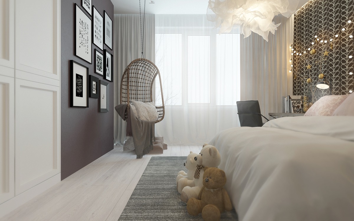 Първата спалня разполага с палитра в цветове въглен черен, светло сиво, бебешко розово и акценти от естествено дърво. Интериорът не е прекалено детински, но са съчетани нюх и мистерия, които могат да предизвикат въображението на всеки, във всяка възраст. Малки изненади радват окото и помагат да се изрази личността на младия жител чрез внимателно подбрания детайл. Колкото повече гледате тази стая, толкова повече я заобичвате!