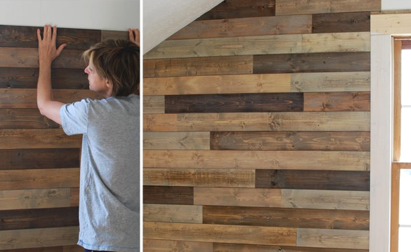Друг пример за стена облицована с дървени летви. Тук особеното е, че са използвани различни видове дърво.
