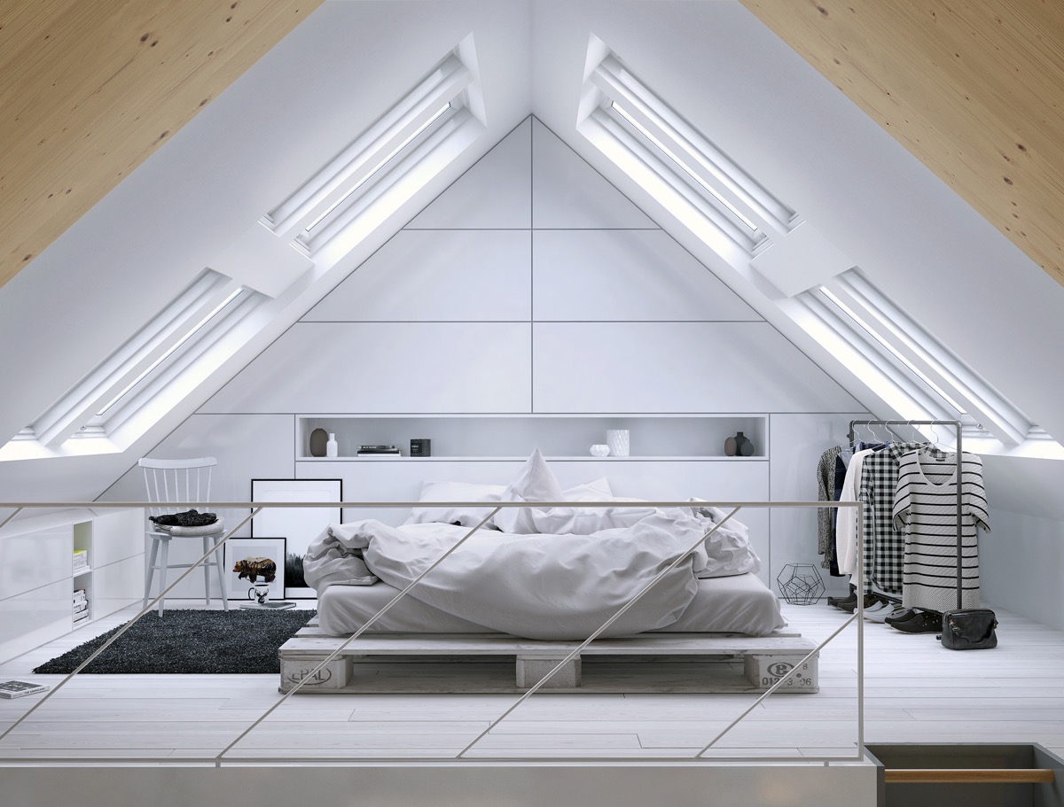 масички за кафе. Тук има стилово съчетание, което постига и живее в абсолютна хармония – модернистична камина, стилизирана глава от лос, черни метални лампиони. А ако се питате къде е спалнята- на втория етаж, всъщност той е посветен само на нея. Бяло-черна, стилна и невероятно просторна заради множеството прозорци по скосения таван.