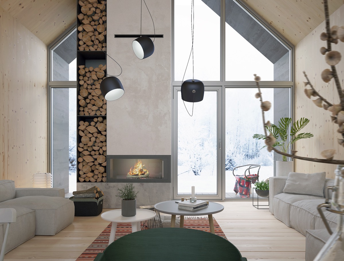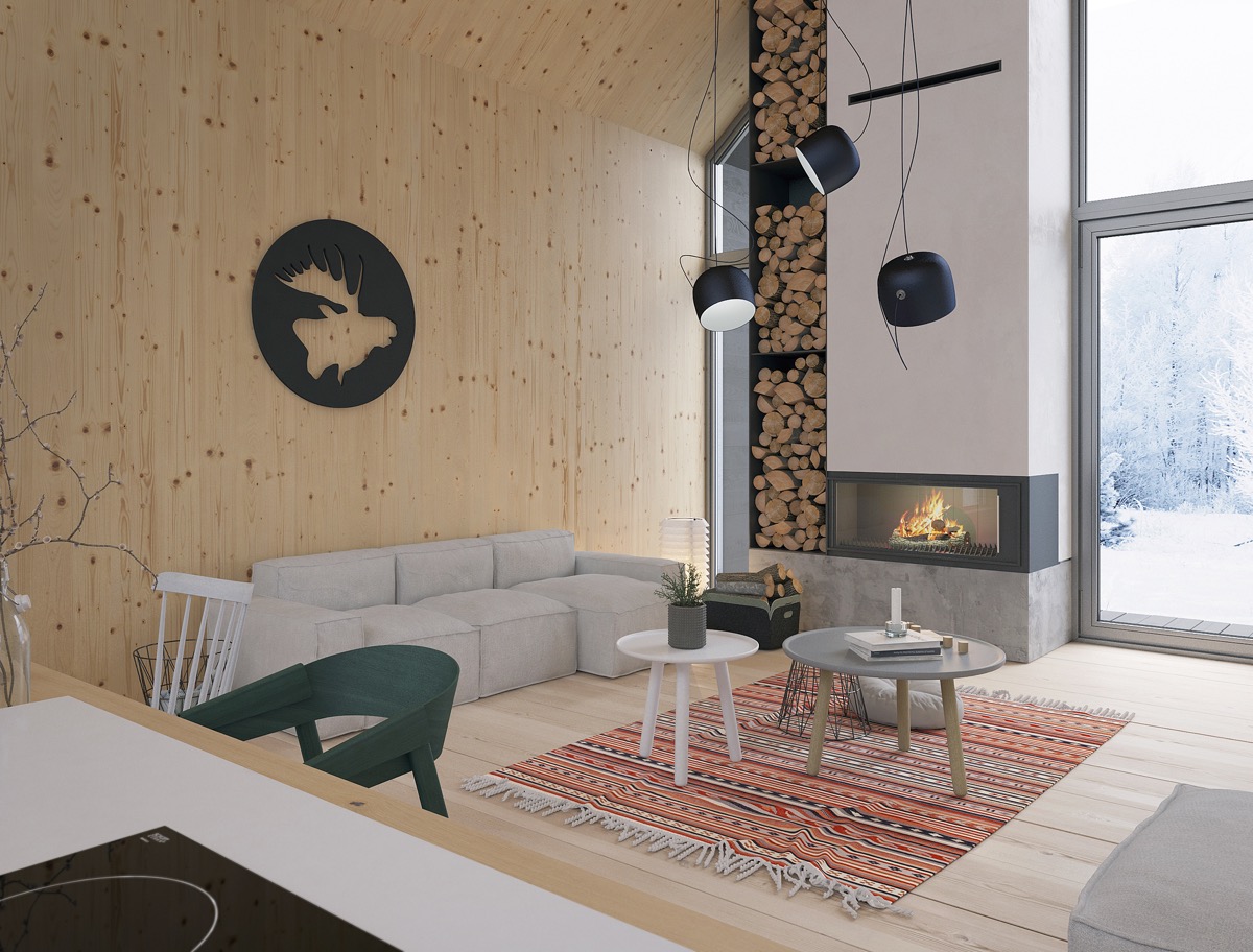 Следващото местенце е същинска зимна приказка! Вие се намирате в едноетажна хижа, едната страна на която е изградена от панорамни прозорци, а до заледената веранда се надига парата от външния горещ басейн. Гърбът на тази прелестна хижа по скоро прилича на гърба на крепост или военно убежище, но в това има доста смисъл ако се намираш насред гората. Вътрешността на тази крепост ни разкрива високи тавани но ниска мебел. Цялата е облицована в дърво с изключение на пода, а непринуденият интериор те потапя в уют. Съвременна стена-камина минава през средата на основното помещение, като едновременно с топлината постига