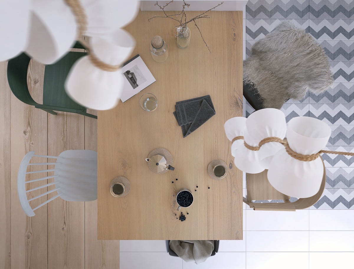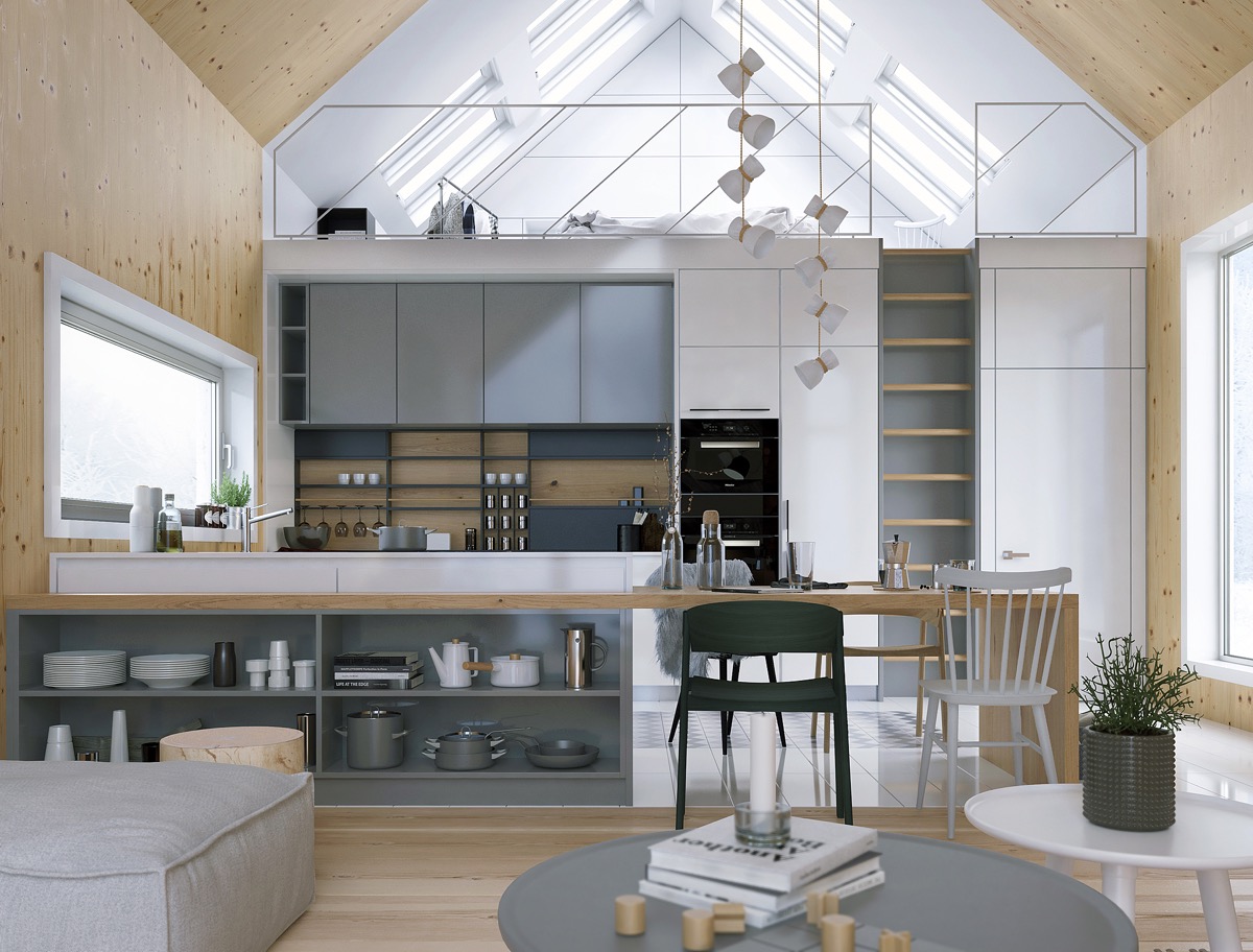 Весел разноцветен диван е всъщност куп големи възглавници, които ти позволяват във всеки един момент да придърпаш някоя по-близо до огъня. Вътрешността е деликатно разделена посредством няколко стъпала по цялото протежение на късата страна. Стълбите са освен идеални за сядане, отлично местенце за домашната фонотека или библиотека. Изкачете няколкото стъпала и ще се озовете в изцяло дървената кухня и трапезария. Семпъл кухненски модул с метален плот, семпла дървена правоъгълна маса и две заоблени пейки осигуряват така нужната почивка за сетивата.