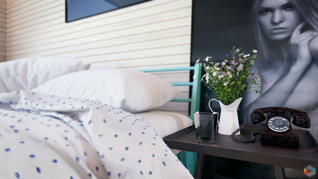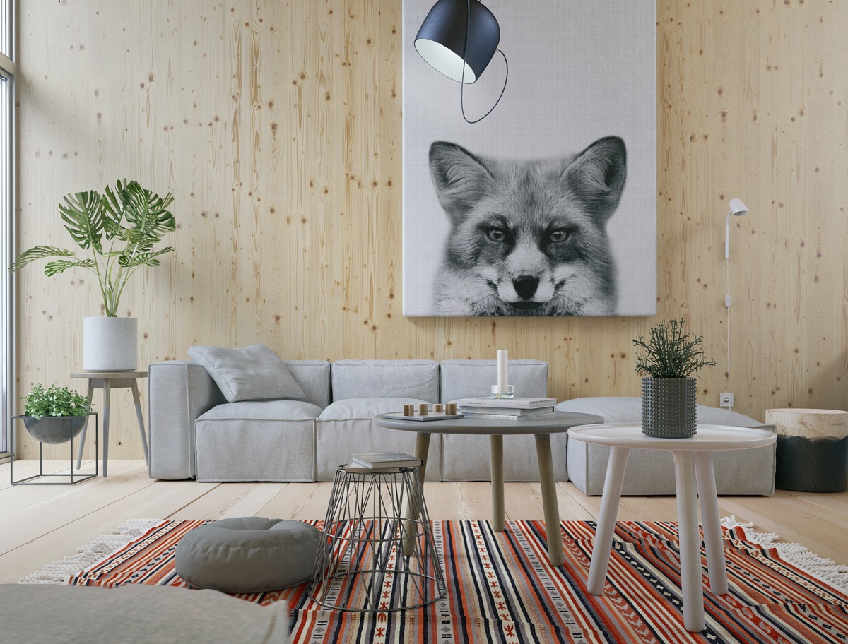 пухен и мек дизайн, поставен сред домашни стайни растения, който украсяват свежи модерни цветарници. Над удобния диван е окачена черно-бяла фотография на лисица, от където ни гледа дивата природа. Местата за сядане не са ограничени до вместимостта на дивана. От едната му страна са нахвърляни черни възглавници за под, които правят компания на табуретки от дървесни пънове. В средата на стаята е