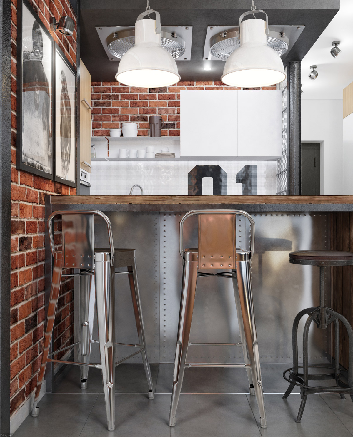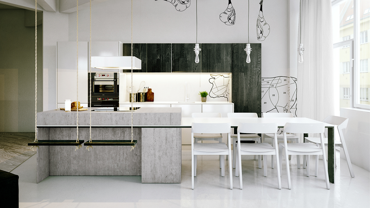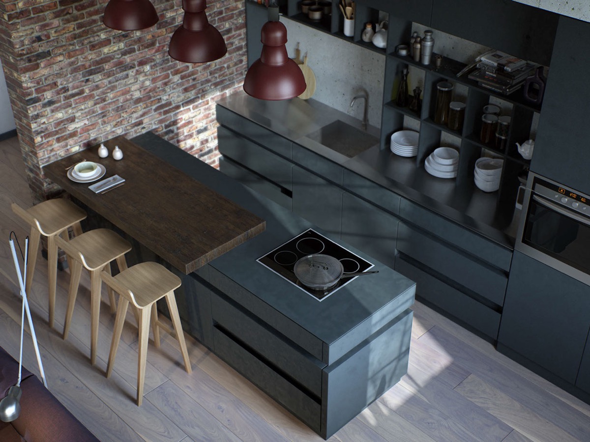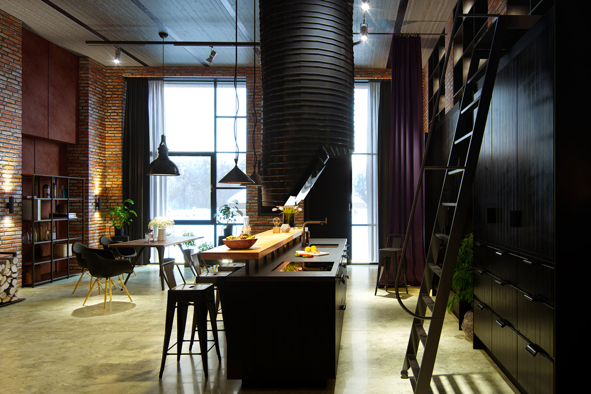 Кухните в индустриален стил са известни с просторно оформление и функционалност. Използването на различни нюанси на сивото е лесен начин да направите така, че стаята да изглежда в промишлен стил.