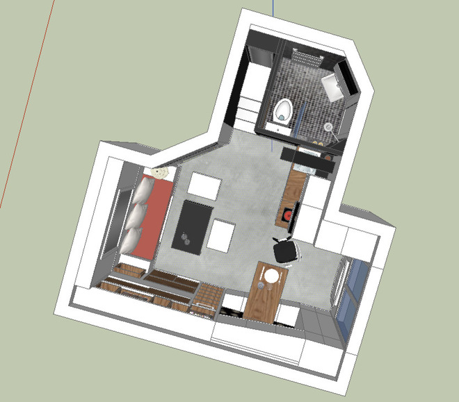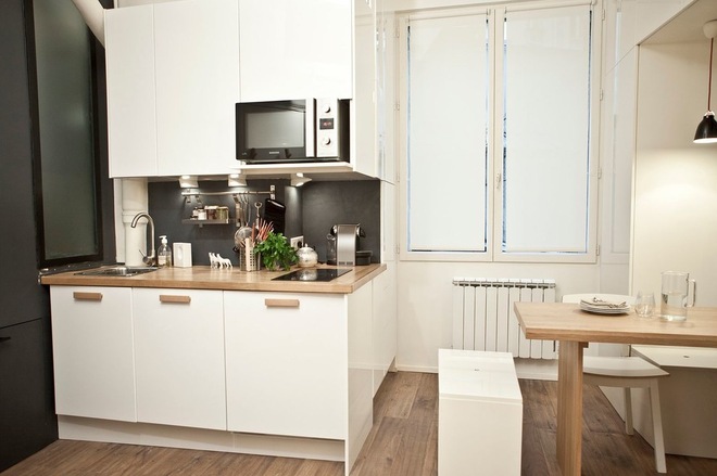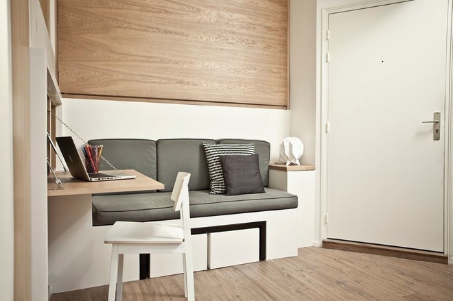 За да се извлече максимума от външната светлина, архитектът е решил да използва шкафове, покрити с гланцов бял лак – по този начин се отразява светлината. За кухнята, архитектката е избрала класически шкафове с плот от дъб и дръжки за вратите. В другия край на този малък апартамент, диванът, изработен от гипсокартон, обособява зоната за сядане. В непосредствена близост до дивана, архитектът добавя доста място за съхранение. Тези шкафове са идеални за съхранение на всякакви видове вещи. За зоната за спане, архитектката е усетила „че е жалко да се прилага конвенционален начин и да се използва разтегателен диван за спане“. Признава си, че дизайнът на леглото е бил кошмар. В края на краищата, са избрали за система с добавени спирачки, за да се омекоти спускането и каишка, за да се смъква леглото надолу.