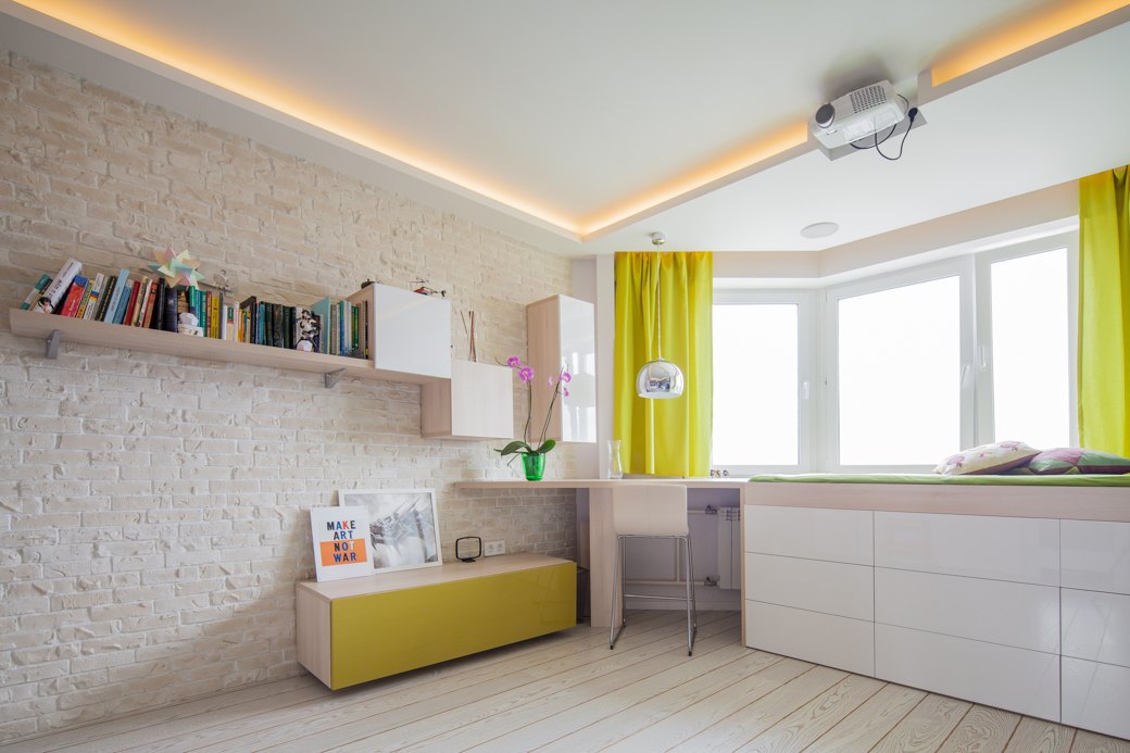 Едната от платформите е допълнение на прозореца, като формира хибридно пространство състоящо се от работен кът, място за спане и шкаф. Комбинацията успява да предложи 3 различни функции в една композиция.