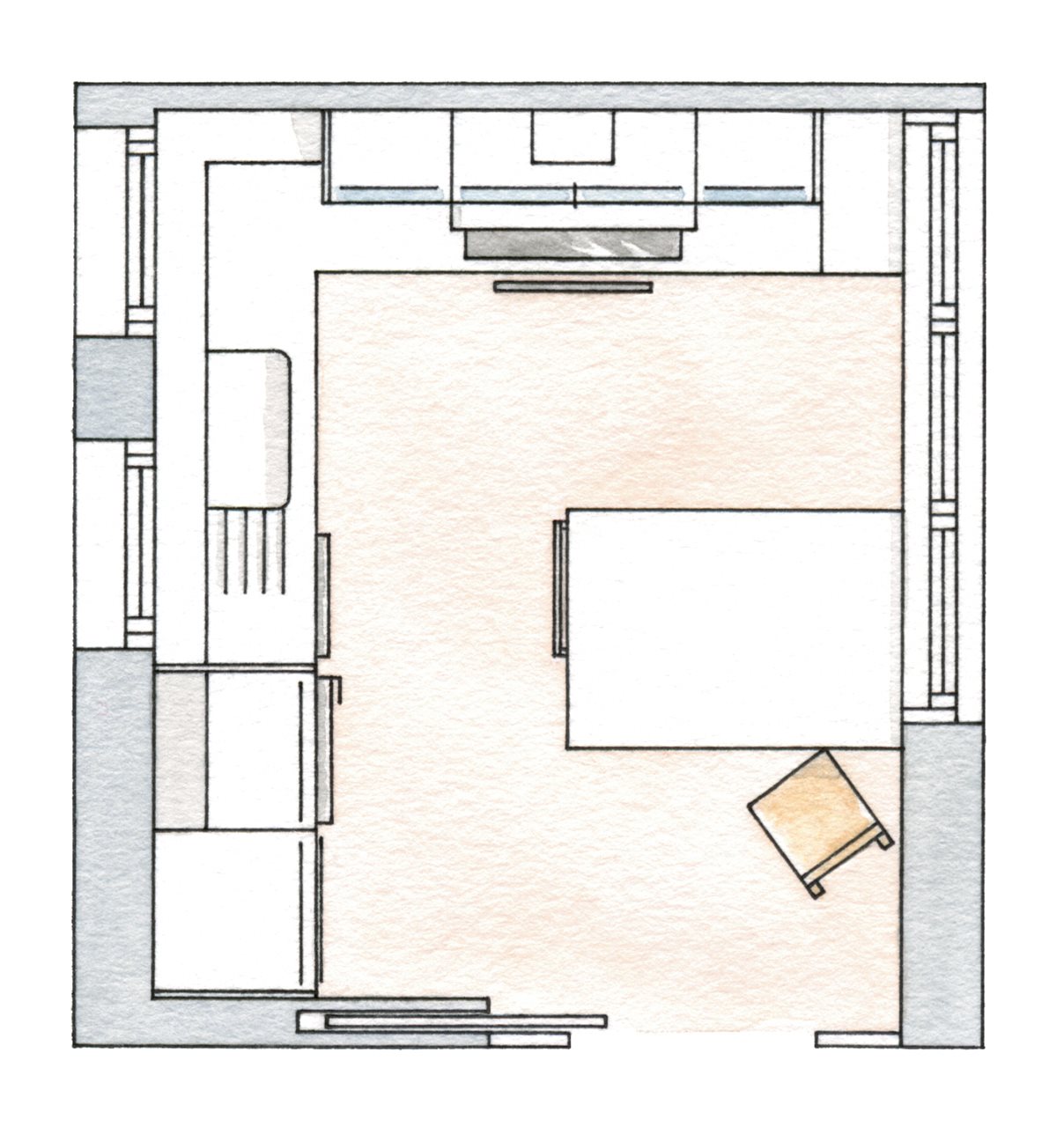 Първото предизвикателство е светлината. За да има достатъчно естествена светлина дизайнерът избира да сложи два вместо един прозорец, които гледат към всекидневната. Другият трик, които ще накара кухнята ви да изглежда значително по-голяма, е основният цвят в нея. Тук цветът на вградените мебели и шкафове е бял, за да придава повече свежест и простор. В услуга на тези усещания са и липсата на типичните шкафове на нивото на погледа ви, е с едно изключение, но там пък се намесват матираните вратички. Така че дори малкото окачени шкафове са доста прозрачни. Всички кухненски уреди са вградени и маскирани с вратички, за да пестят място и да създадат хомогенен завършек.
