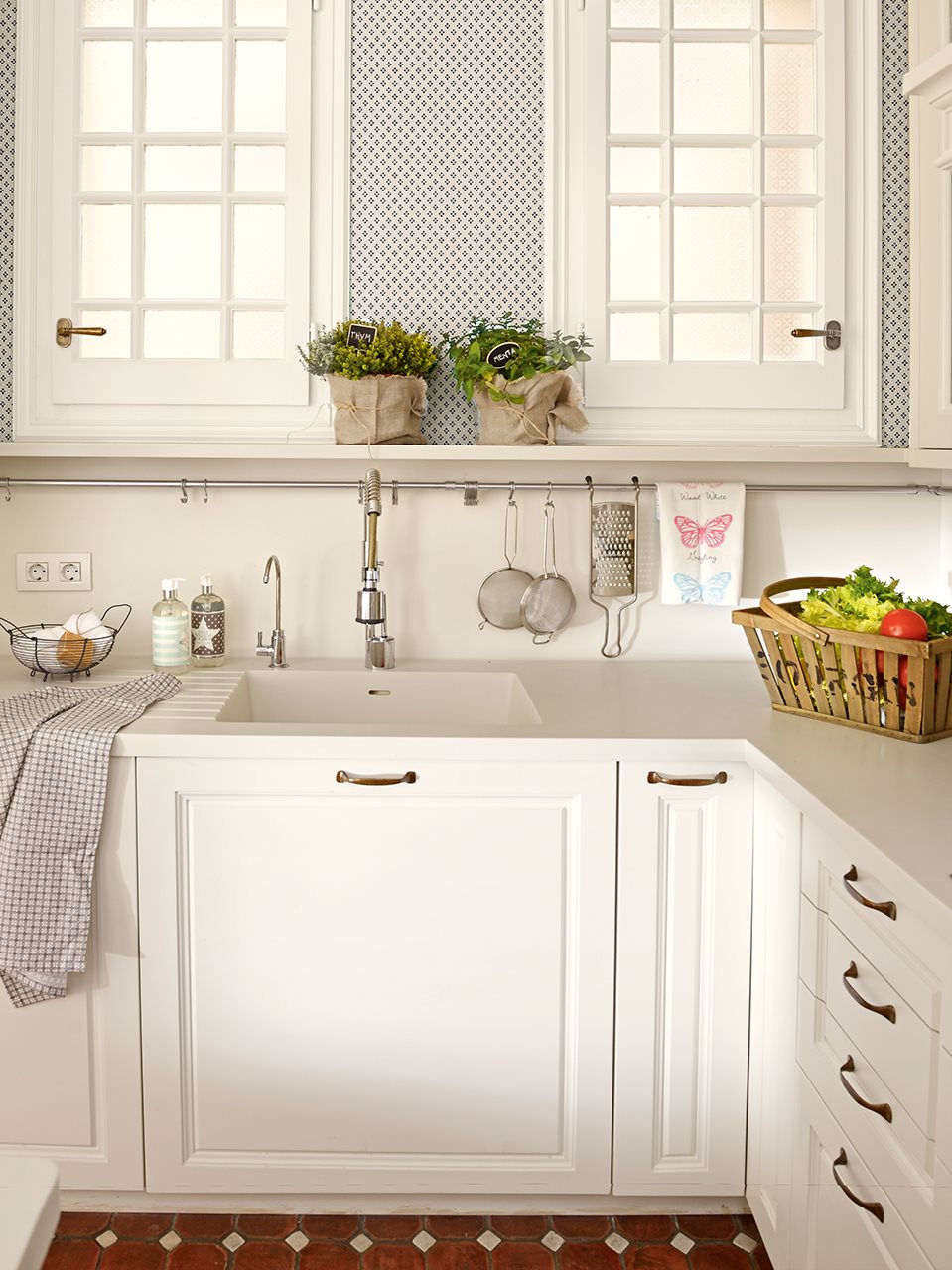 В този бял рай, няколко саксии с билки не биха навредили, а напротив, ще внесат така нужната нотка зеленина и свежест. Всичко що е инокс може да остане на открито, тенджери, тигани и прочие. Това се отнася и за дървените елементи, които ще се съчетаят добре с основата на кухненската маса и столовете.