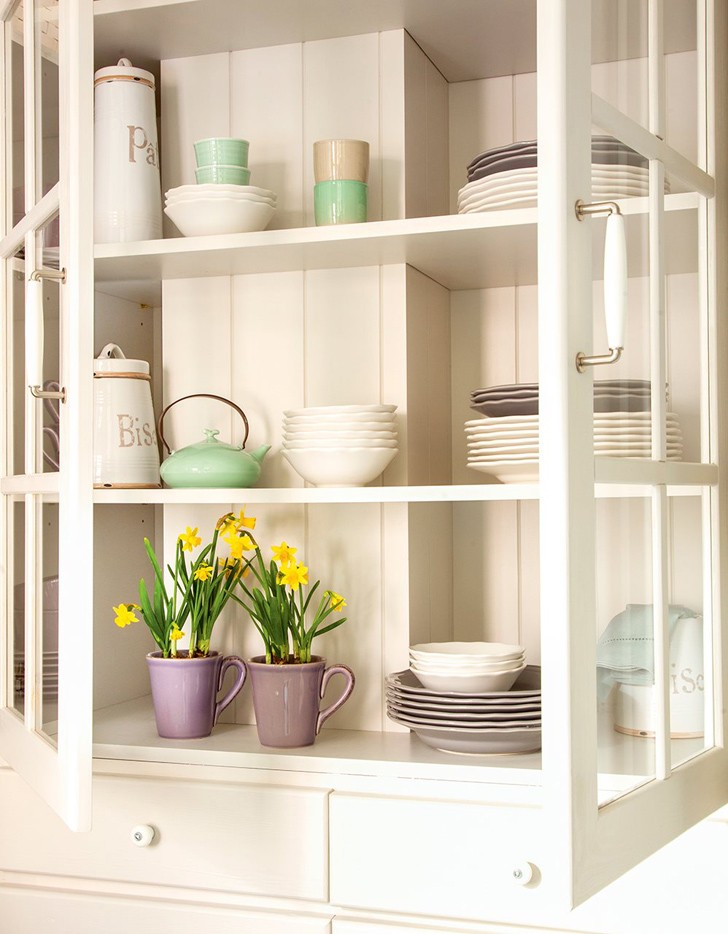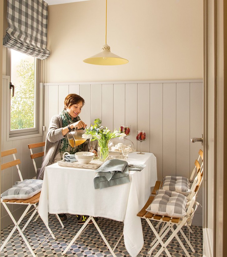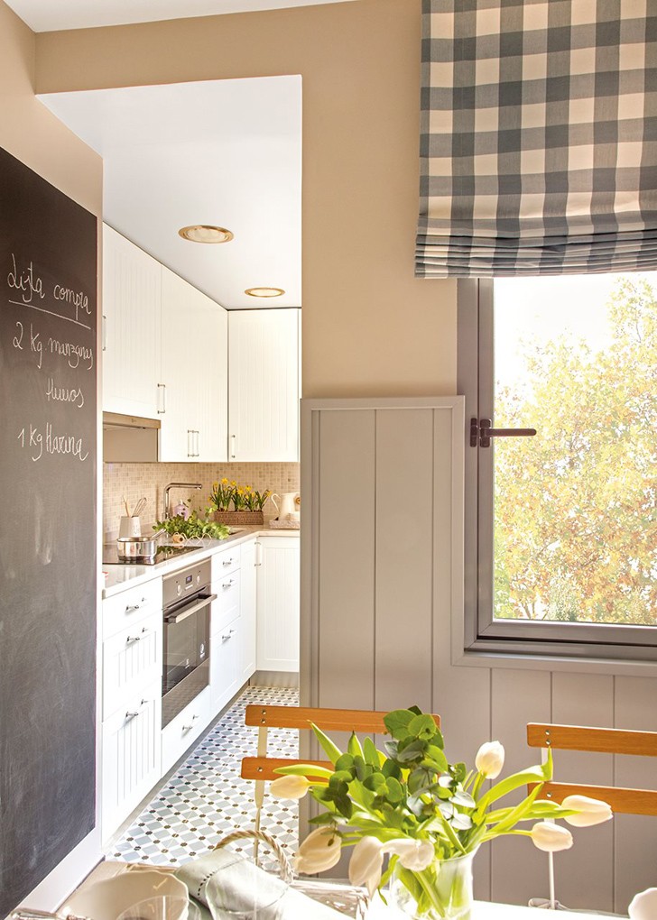 Какво прави тази кухня толкова специална – лъчите от слънчева светлина, веселите плочки на пода, акцентите в пастелни тонове, свежите цветя. А черната дъска е толкова забавна и практична!