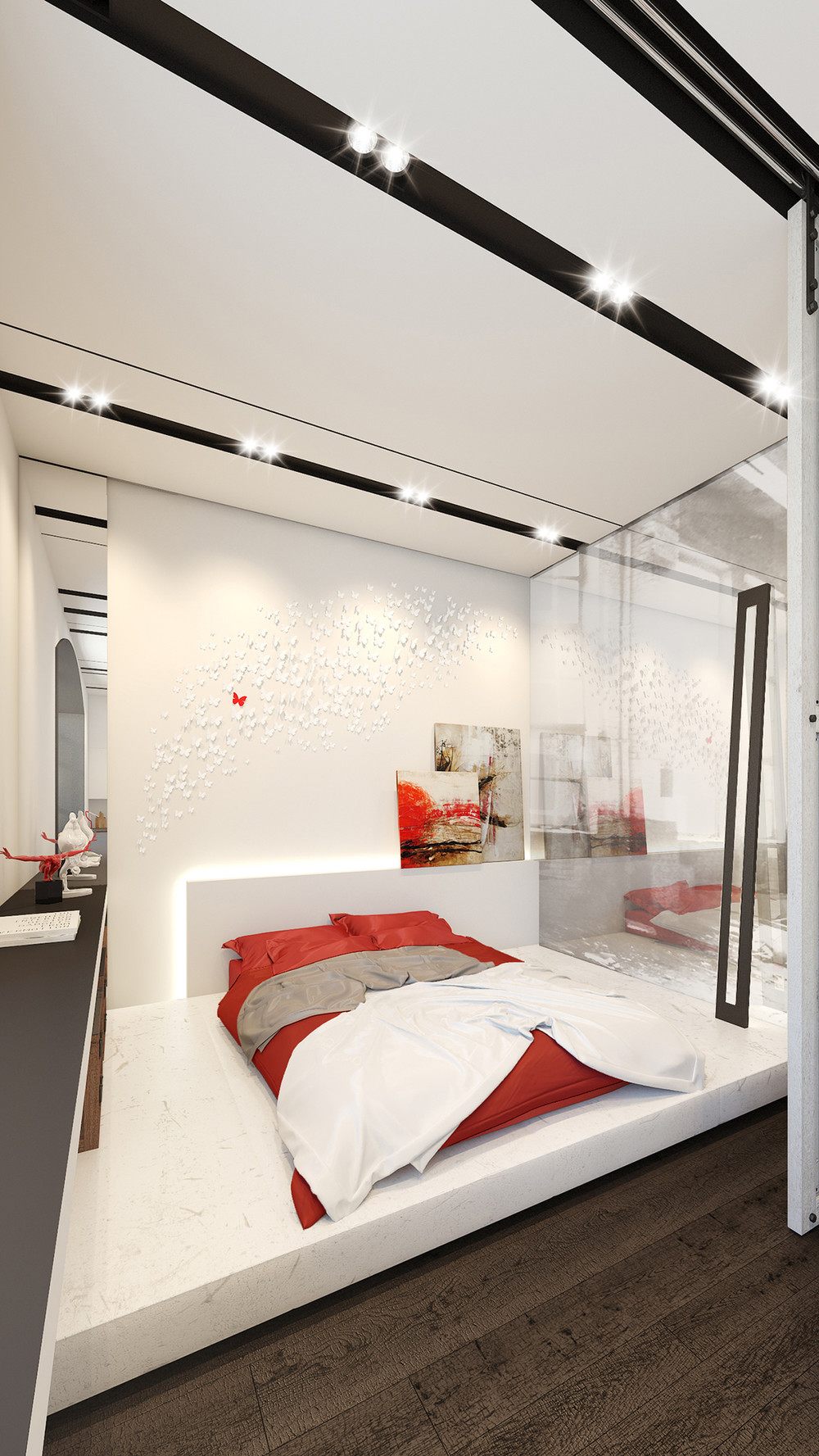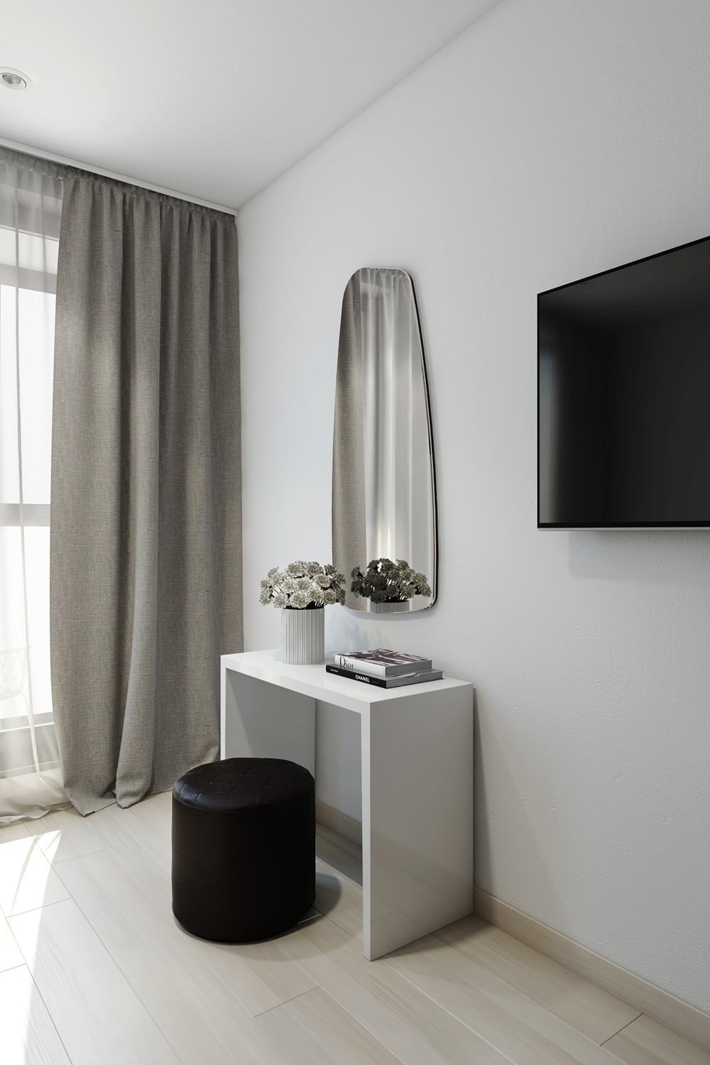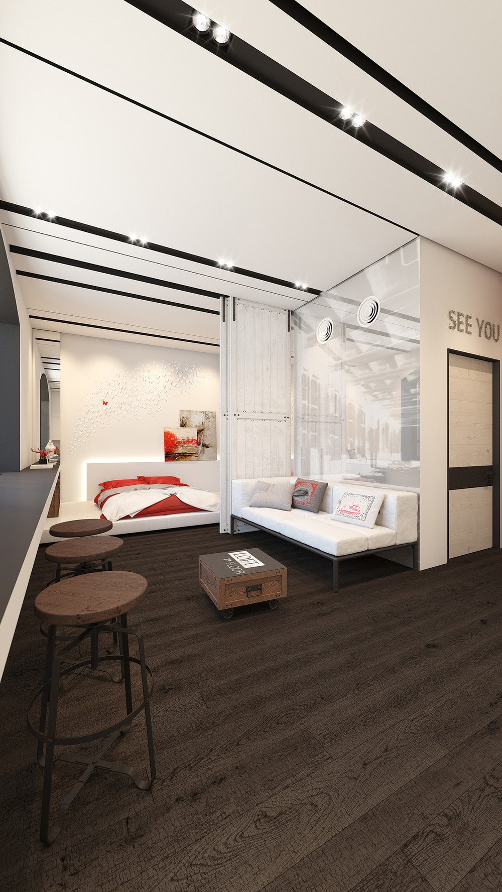 Нека да започнем с един малък апартамент, който се отказва от всякакви цветни детайли или екстравагантен дизайн в полза на един неутрална палитра и разумно оформление. Това е чудесен пример за малък интериор, без да губи своето очарование. Стената осигурява уединение в спалнята, без необходимостта от пълно заграждение. Това решение позволява на светлината да прониква без проблем. Повишаването на функционалността е важна част от всеки интериорен дизайн. Компактната кухня се вписва в нишата до банята и в ляво от входа. Банята е малка, семпла и ефективна. За съберат душа в такова компактно пространство, дизайнерите са избрали модел с две малки врати, оформени в ъгъла. Възможностите за съхранение, обаче са изненадващо просторни.