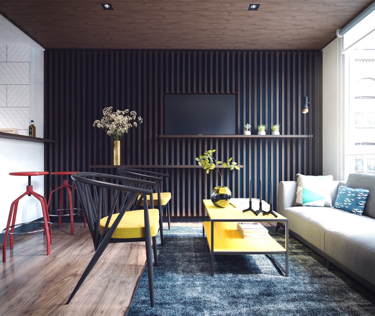 Основните цветове придават на този апартамент от четиредесет и четири кв. м. творческа и завладяваща същност. Той ни показва как различни ярки цветове могат да заемат малко пространство, без да се претоварва окото.