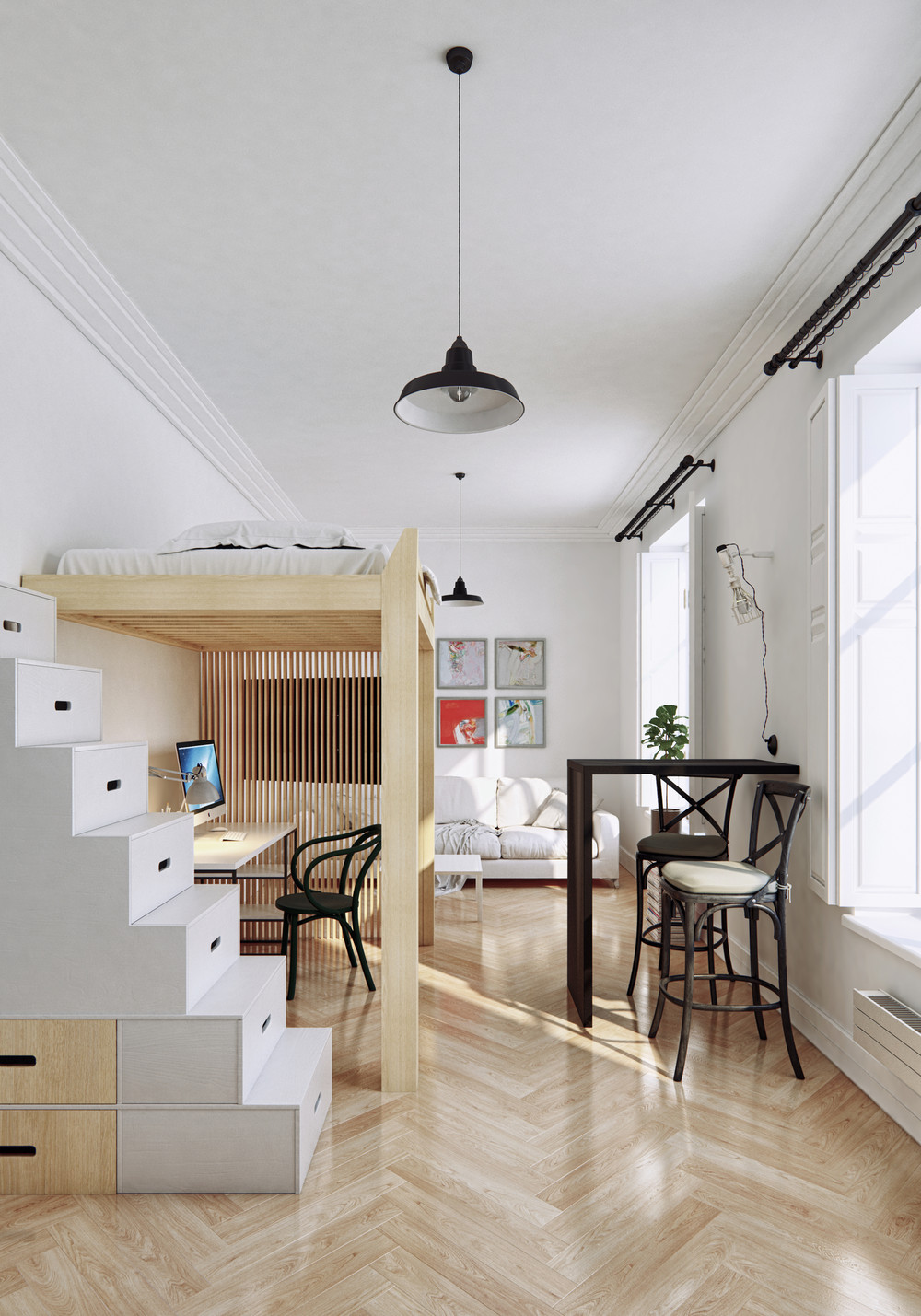 Креативна модулна архитектура разширява използваемите квадратни метри в този компактен апартамент на млад студент. Само на 30 квадратни метра всеки избор е важен!