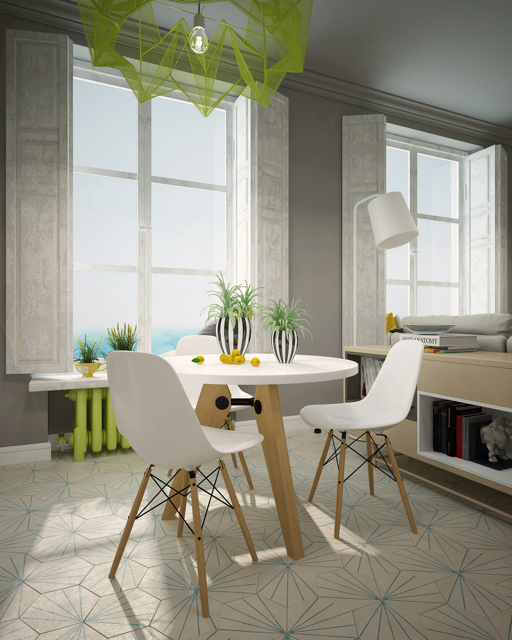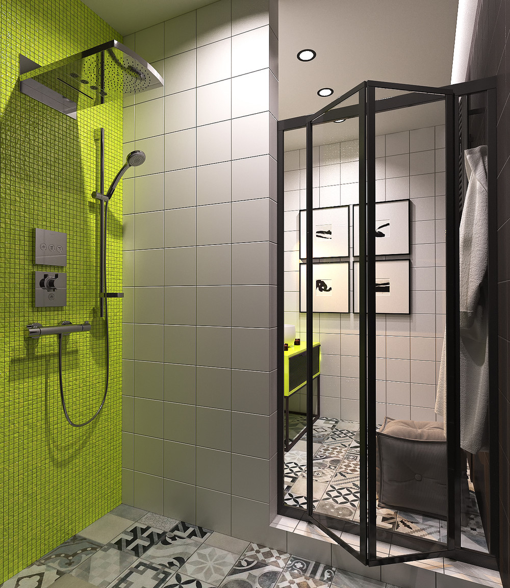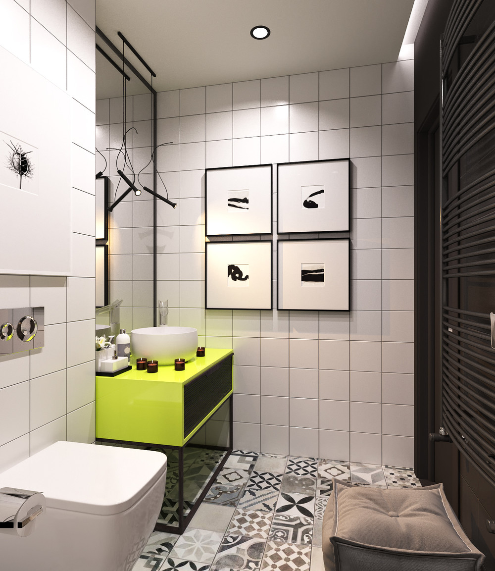 Повечето повърхности са тематични около успокояващ гълъбовосива палитра, изпъстрена с ярки пръски от лимонено жълто и неоново жълто-зелено.