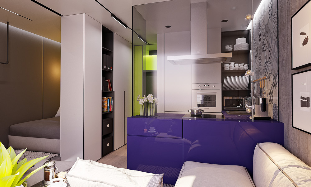 Компактен, колоритен, и удобен! Интериорният дизайнер Alena Fokina концептуализира този малък 28 кв.м. апартамент, така че да отговори на нуждите на изискана млада жена. Неговите ярки цветове допринасят за създаването на една игрива творческа атмосфера, която отразява активния начин на живот и силно развито въображение.