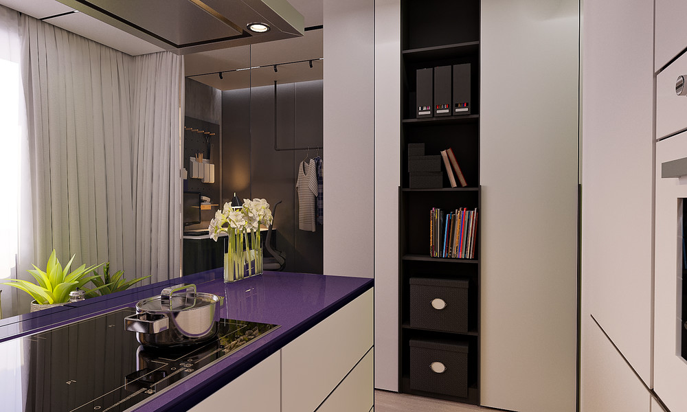 Кухнята е дръзка на първо впечатление с колоритни шкафове в лилаво, но детайлите също са много готини. Плочките в различни нюанси на сивото помагат да се смекчи преходът от белите шкафове към недовършените бетонни стени. Огледала, плочки и зелени панели гарантират, че дори най-малките пространства могат да изразят собствената си велика идентичност. Плочките в черно и бяло поставят неутрален тон за банята, но оживява чрез добавянето на неоново зелено.