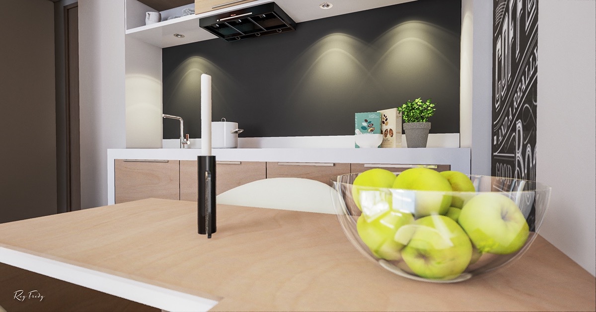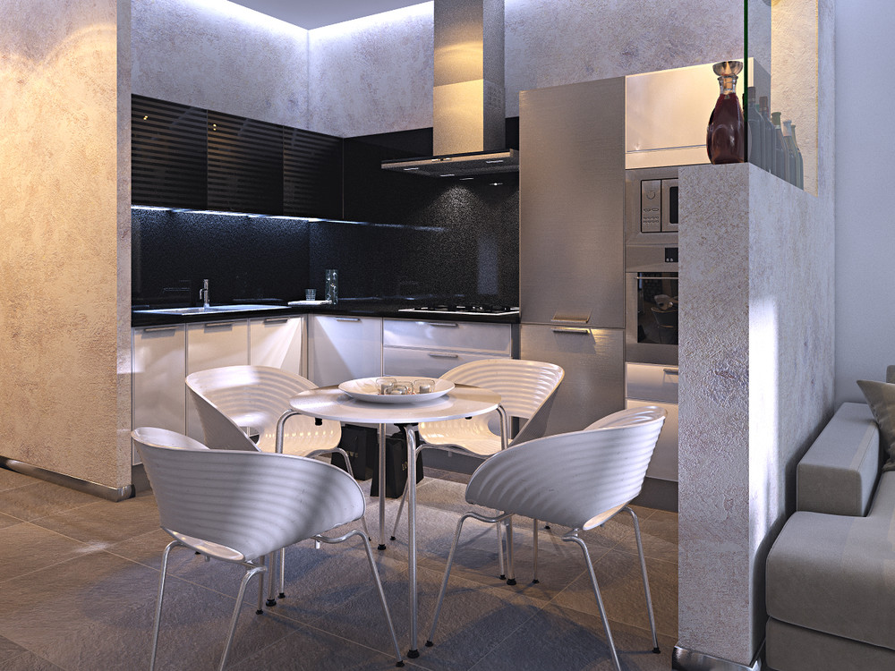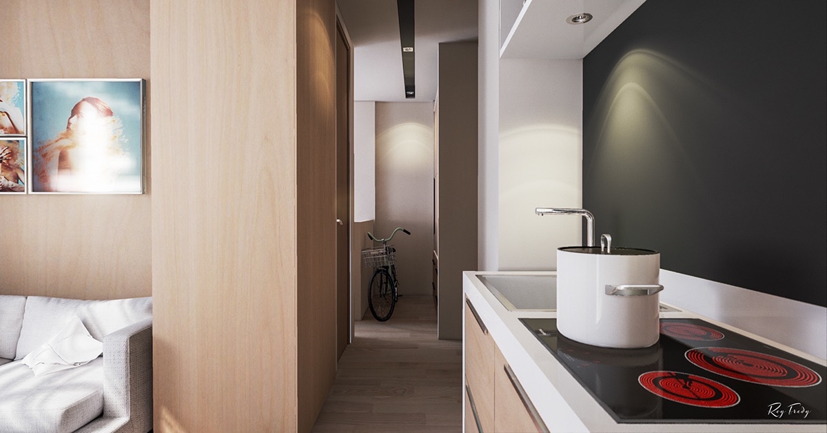 С етажен план на само 39 квадратни метра, този интериор трябва да постигне функционалност с много малко пространство. Дори и с компактно разпределение на етажа, дизайнерът не отстъпва от темата за интересен декор – поразителни текстури и драматично осветление прави интериора чувстват наперен, но отзивчив. Осветление къпе бетонните стени и гладките шкафове от всички страни. В комбинация с линейна архитектура, светлината става органичен декор сам по себе си.
