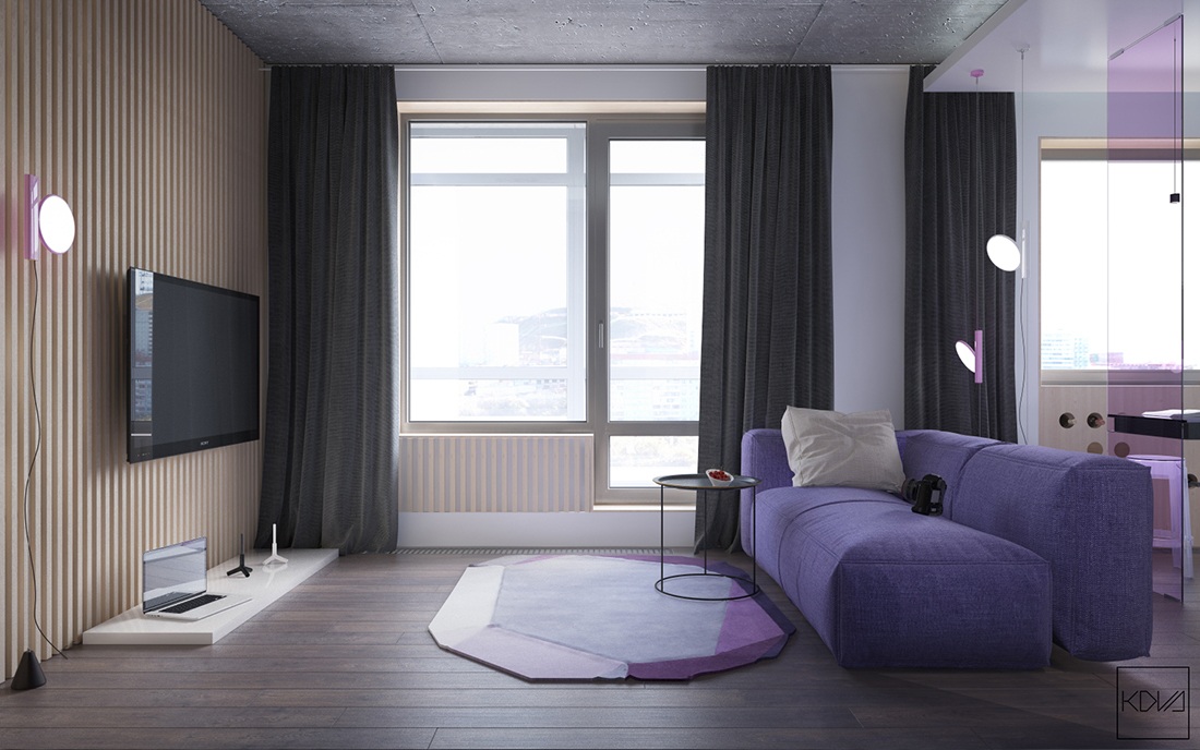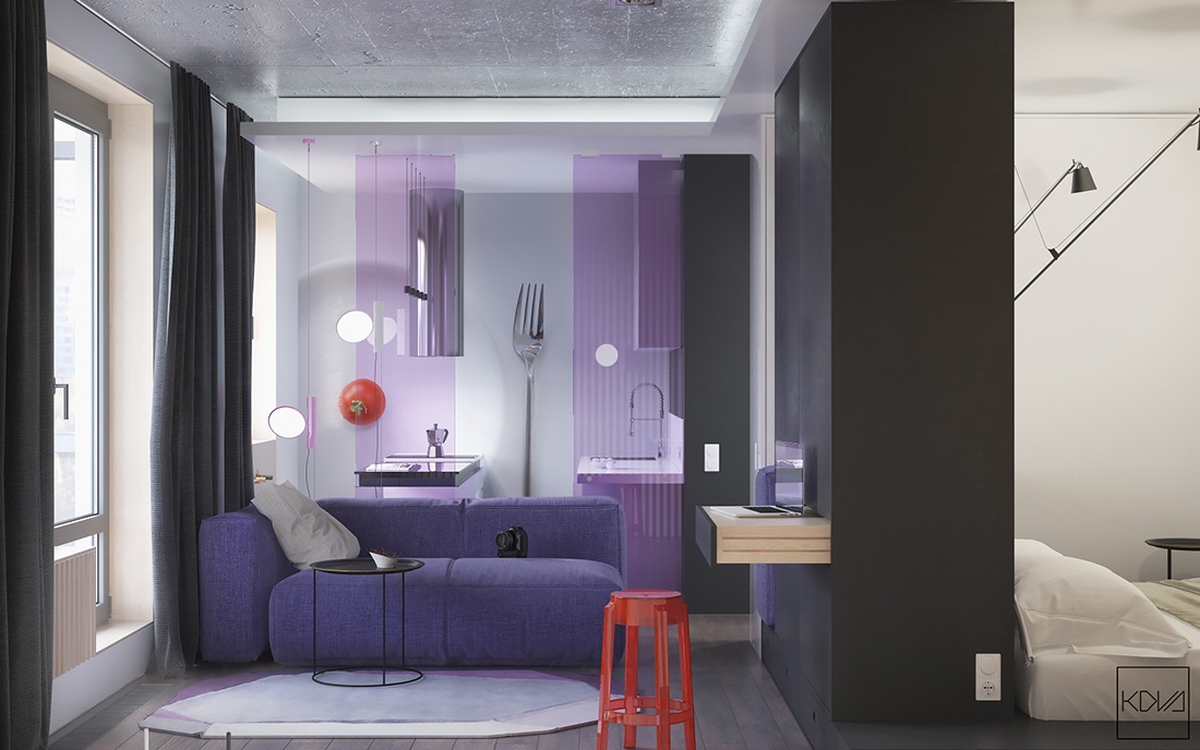 Лилави акрилни панели отделят добре кухнята и трапезарията от хола. Топло вътрешно осветление и удобни мебели играят определяща роля в този модерен градски апартамент. Докато бетонната облицовка иначе би могла да е твърде тежка в апартамент толкова малък, колкото този, то стъклените стени, позволяват на всяка зона да си взаимодейства с другите – за по-просторна и безгрижна естетика. Гладките дървени подове правят интериора да изглежда по-приветлив. Украсен със стъкло и бетон, арматура и дърво – перфектно индустриален, но изненадващо уютен.