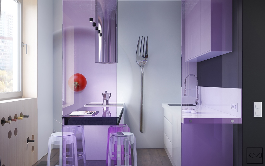 Този малък апартамент определено не се плаши от приключението на една смела тема за декор. Виолетово, лавандула и ярко огнено червено определят интериора – благодарение на внимателни техники за декориране. Ярките цветове са трудни за работа в стеснени малки пространства. Така че, дори и да не обичам цветовете, които са използвани туи, си заслужава поне да се опознаят техниките за композиция между тях. Рисковите дизайнерски решения наистина се изплащат. Текстурирани стени, светли мебели и контраст – всички те “заповядват” възхищение.