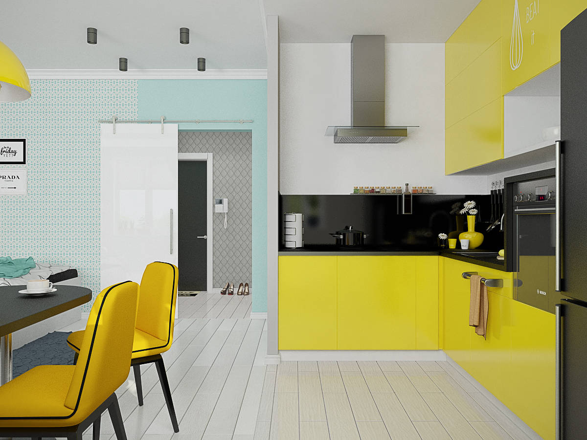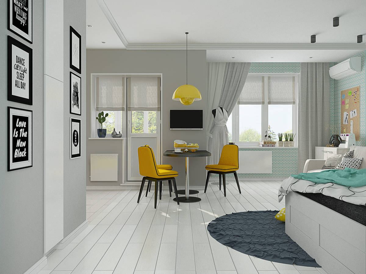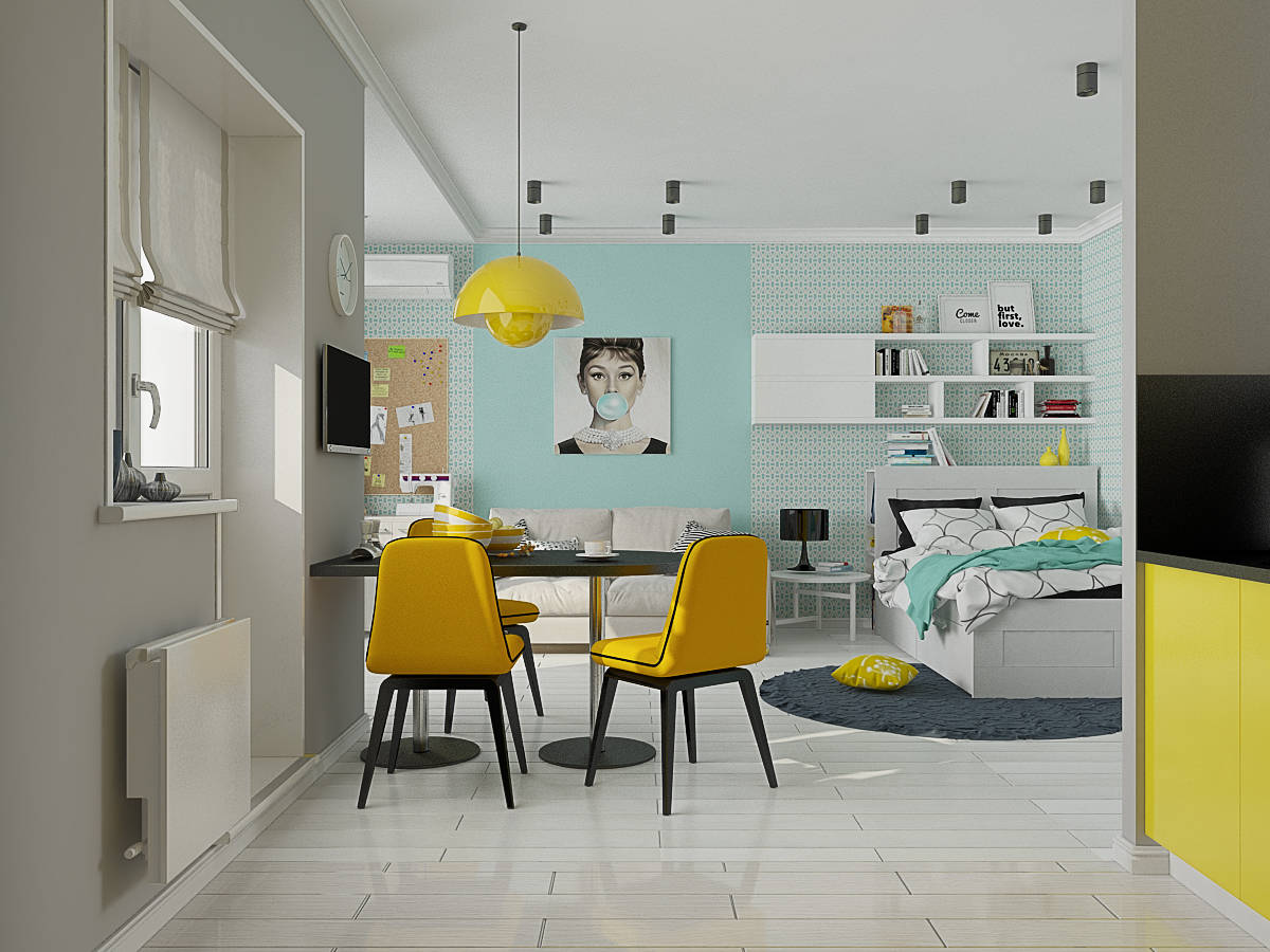 В това малко, но весело пространство умело са съчетани неоново жълти тонове и пастелен светъл тюркоаз. Обитателката на студиото е творческа личност, чието хоби е да създава дрехи. Кухня, трапезария, всекидневна, спалня и дори работно пространство – всички те са обособени като отделни кътове, които преливат един в друг без да си противоречат. Осветителните тела в дома са разнообразни – от висящи до насочващи луни, а най-голямото предимство на това жизнерадностно малко студио е наличието на естествена дневна светлина, която приятно нахлува в студиото. Пространството под леглото се използва за съхранение на вещи.