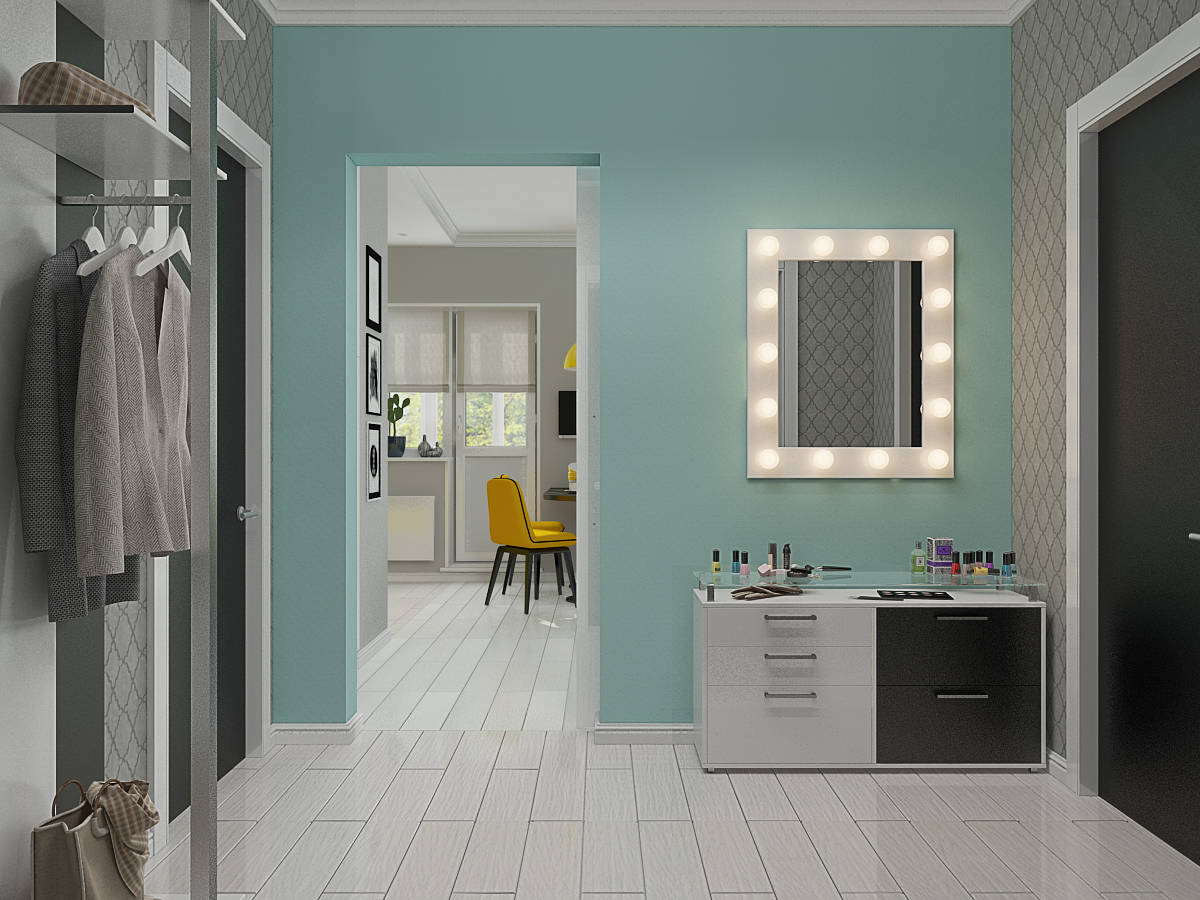 От спалнята се излиза в кокетното антре, в което освен закачалка има и своеобразна гримьорна. Разгледайте галерията за да се насладите на страхотните интериорни решения в това малко студио.