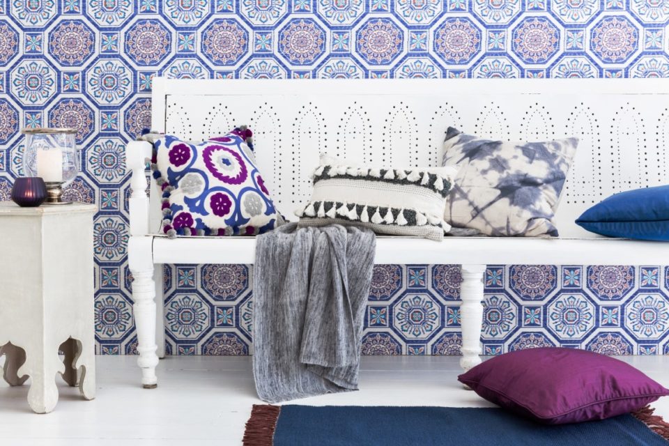 Мароканският стил се фокусира върху геометрични мотиви и разнообразие от текстури, напомнящи за специфичната архитектура на страната. Не всеки от нас разполага с облицована с плочки стена, но пък лесно може да постигне подобен ефект с подходящия фигурален тапет или да подбере такъв тип тапицерия за мебелите си. Мотивите на тухли и плочки са в комбинация с приятни на допир материи и са просто нещо, което искате да имате в дома си. Не забравяйте, че в стаята ще са ви необходими поне два цвята със силно и категорично излъчване, тюркоазено синьо или скъпоценното пурпурно. Диванът ви трябва да е отрупан с меки възглавнички и покривала на слоеве.