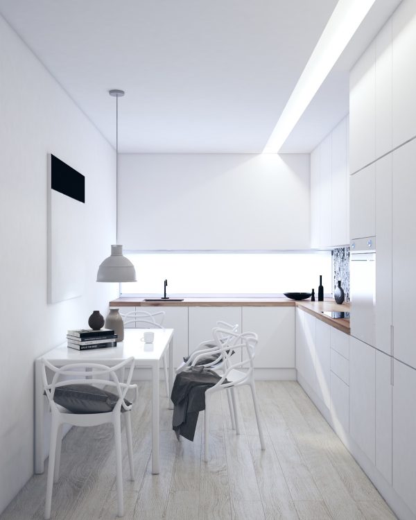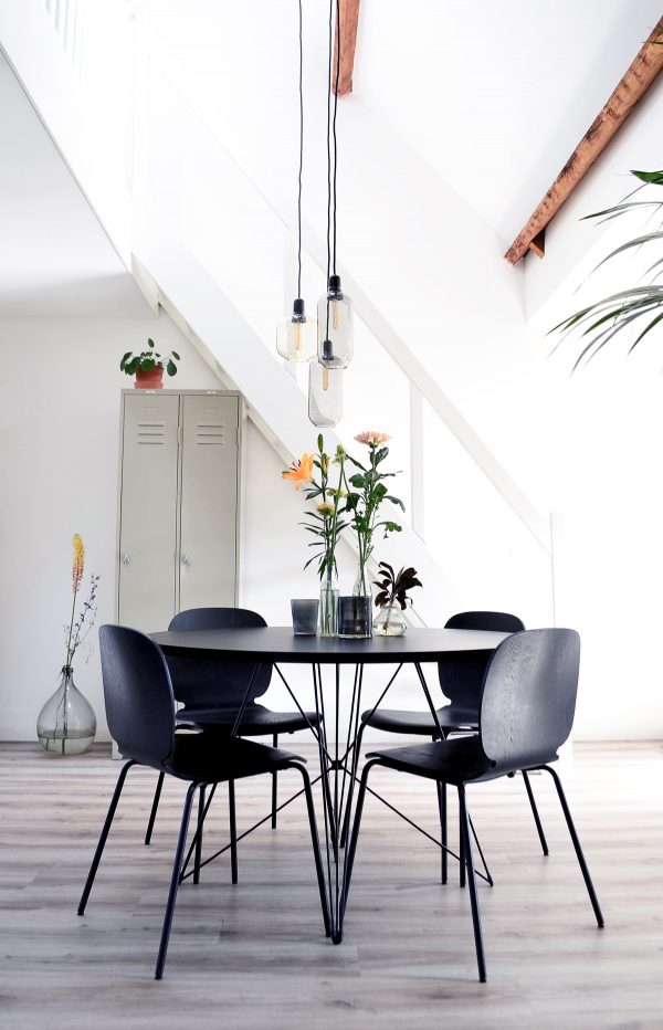 версия на същия тип столове кореспондират с белите кухненски шкафове, а меките дървесни отблясъци на дървения под в комбинация с кухненските плотове, добавят така нужната топла нотка.