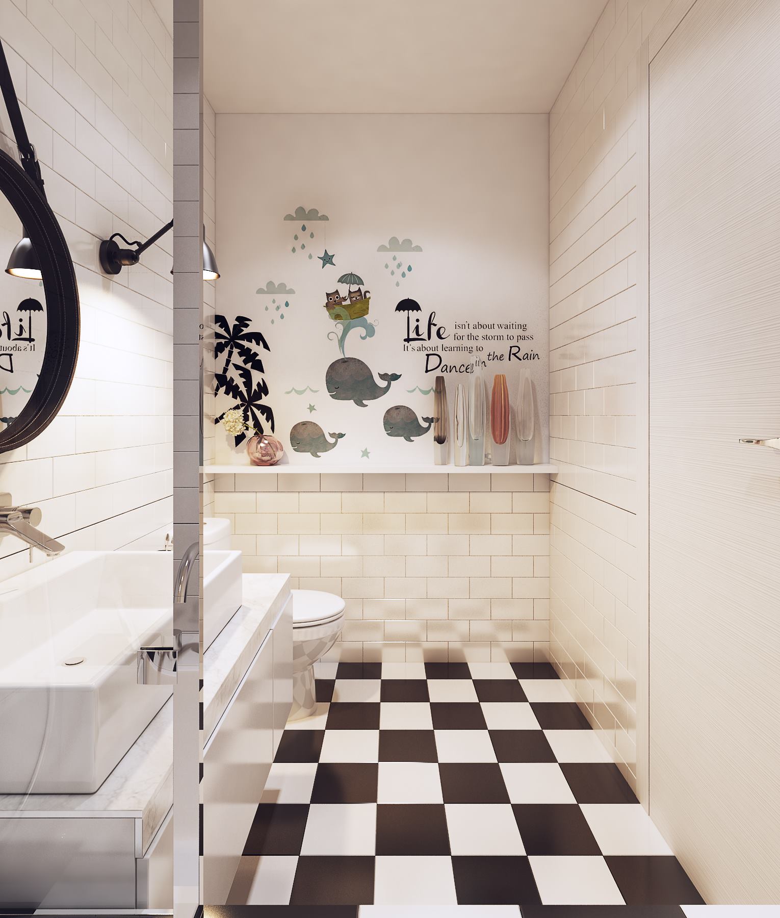 Баните са средно големи, като акцентът и в двете е върху пода и веселите стикери на стената и картината.