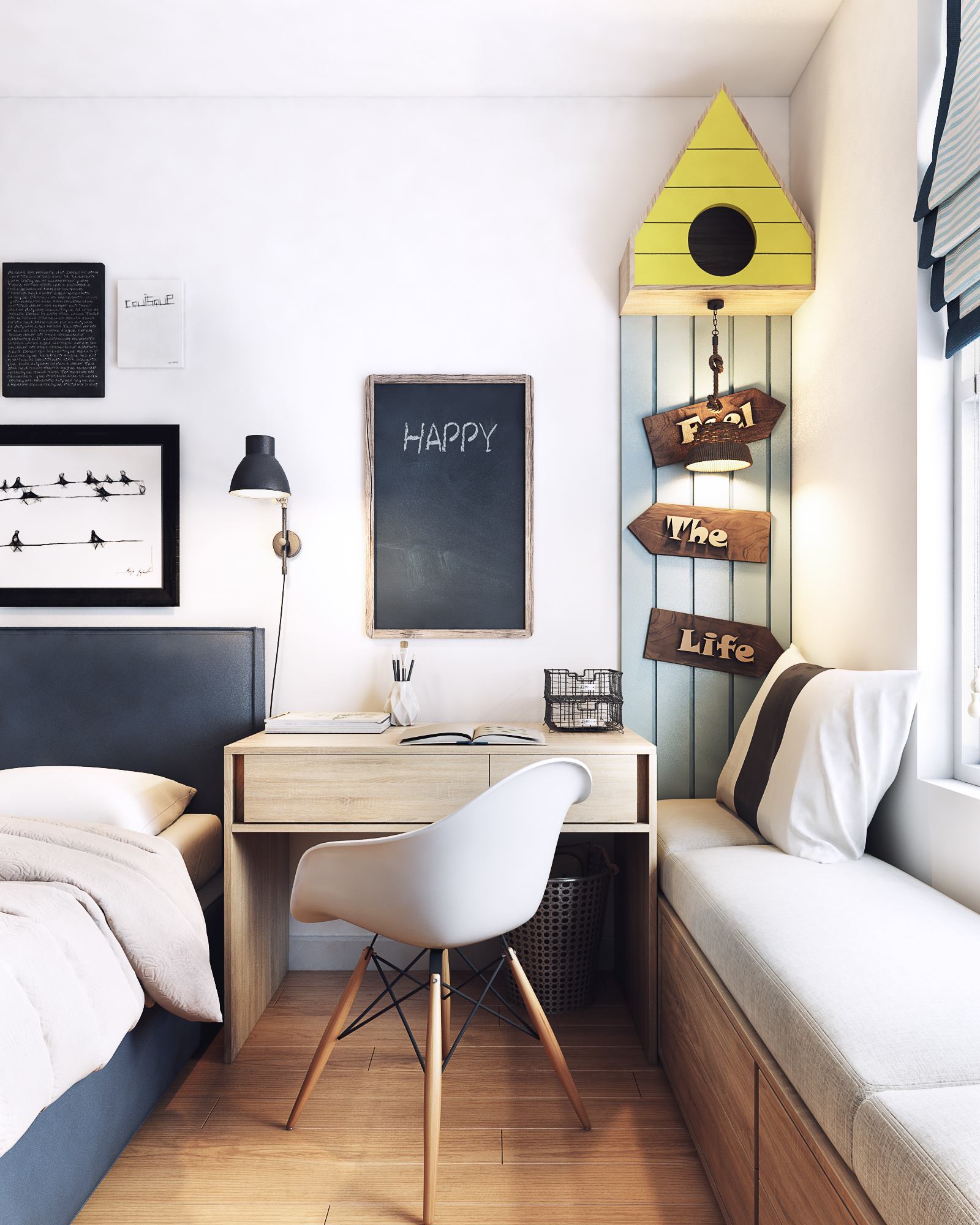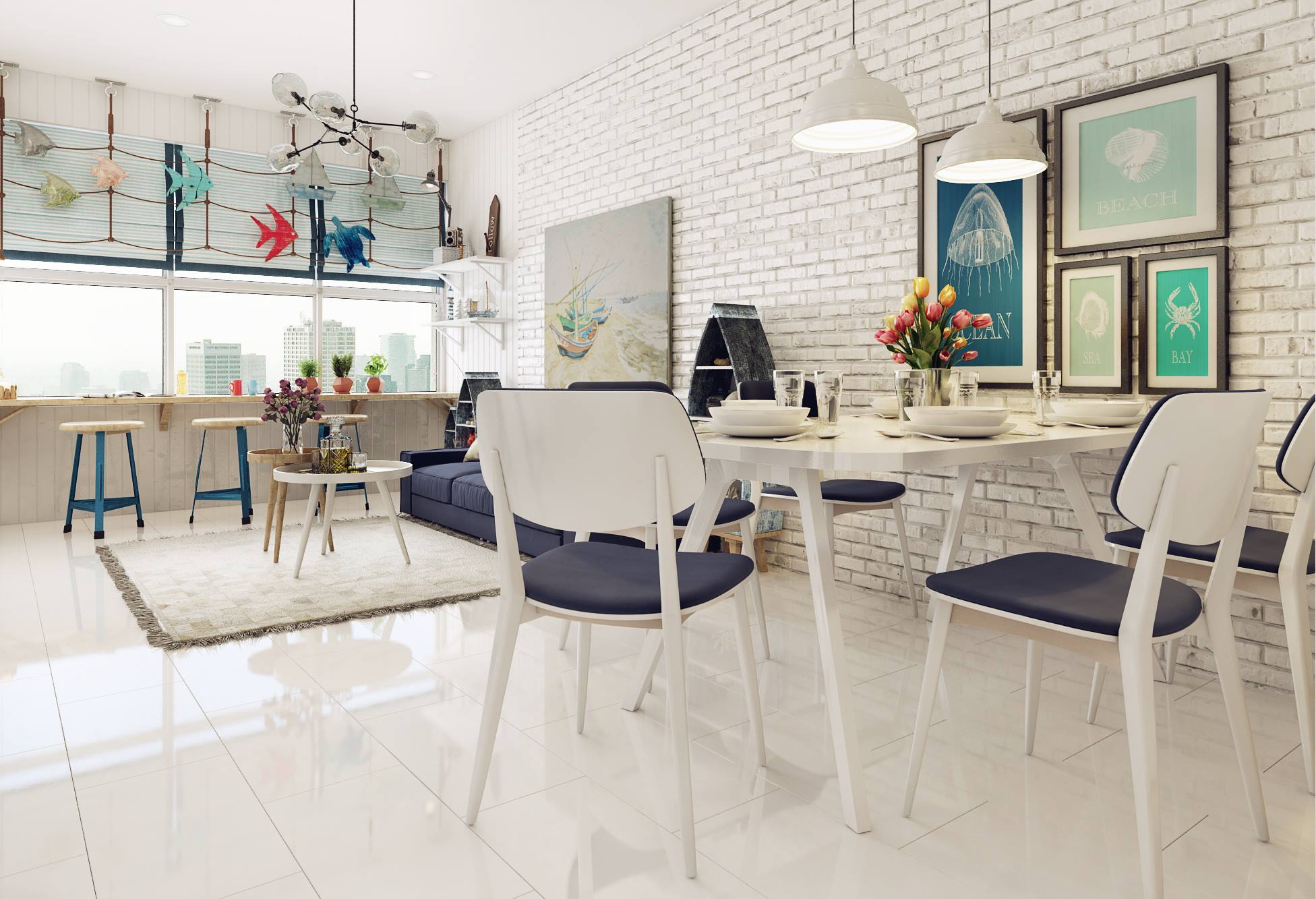 Линиите са изчистени, а декоративните акценти са прецизно подбрани. Дизайнерът е добавил и цветове като жълто и светло синьо. Морските акценти по стените ни карат да си мечтаем за лято, океан и плаж.