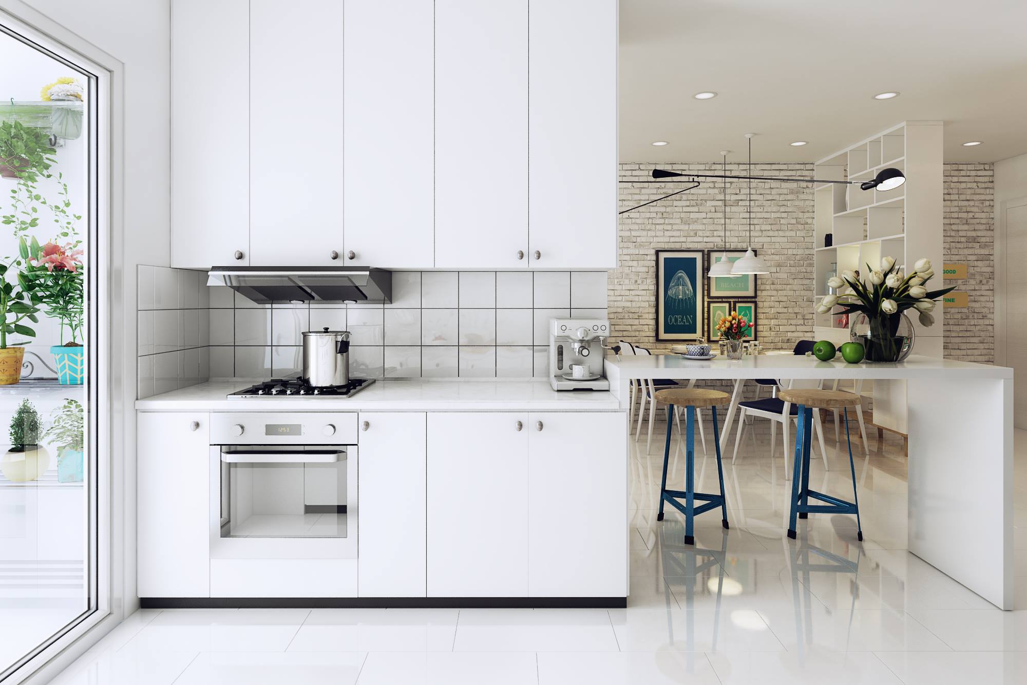 Основното в него са светлите, бели цветове, които са задължителна част от интериора на скандинавския дизайн. Тук бялото се използва главно за стените и пода, а може и за завесите или щорите. Бялото е универсален и класически цвят и ни позволява да го комбинираме с различни мебели и аксесоари. А бялата тухлена стена в дневната ни е фаворит.