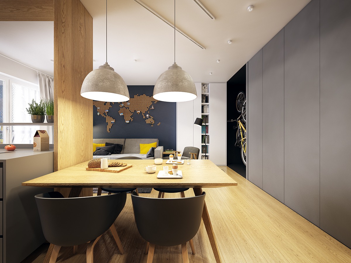 Лесно се забелязва картата на света, изградена от малки коркови блокчета и отбелязаните с лазер очевидно скоро посетени места.модерен апартамент всекидневна и кухня
