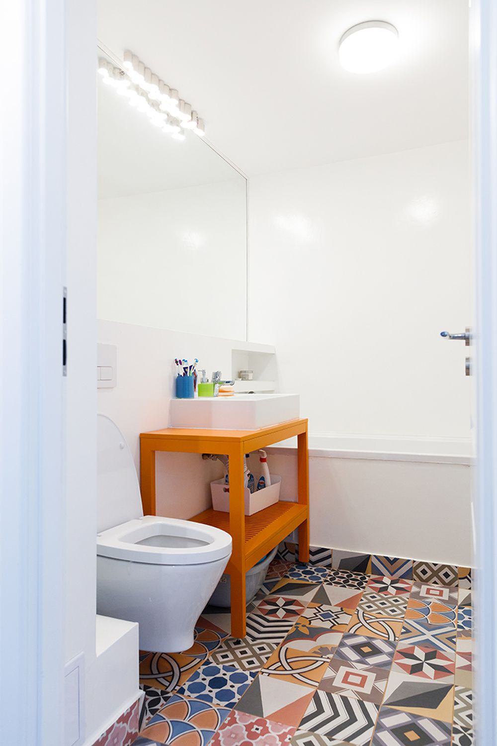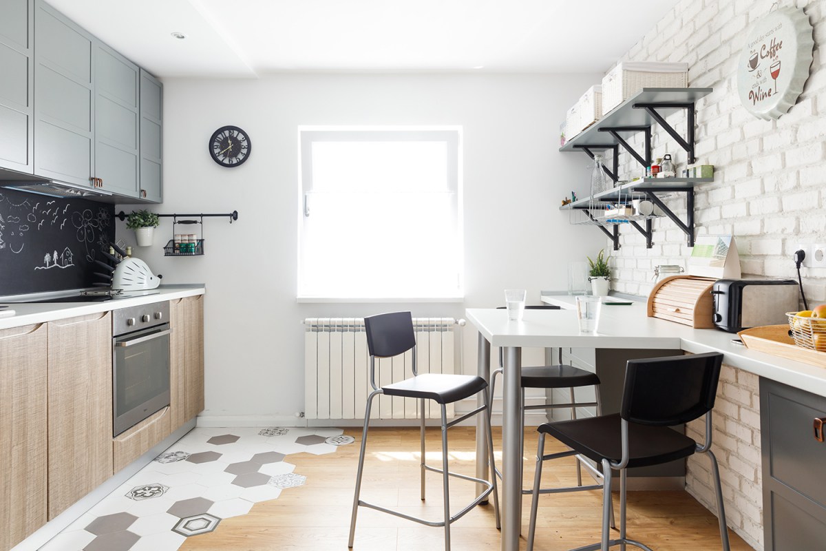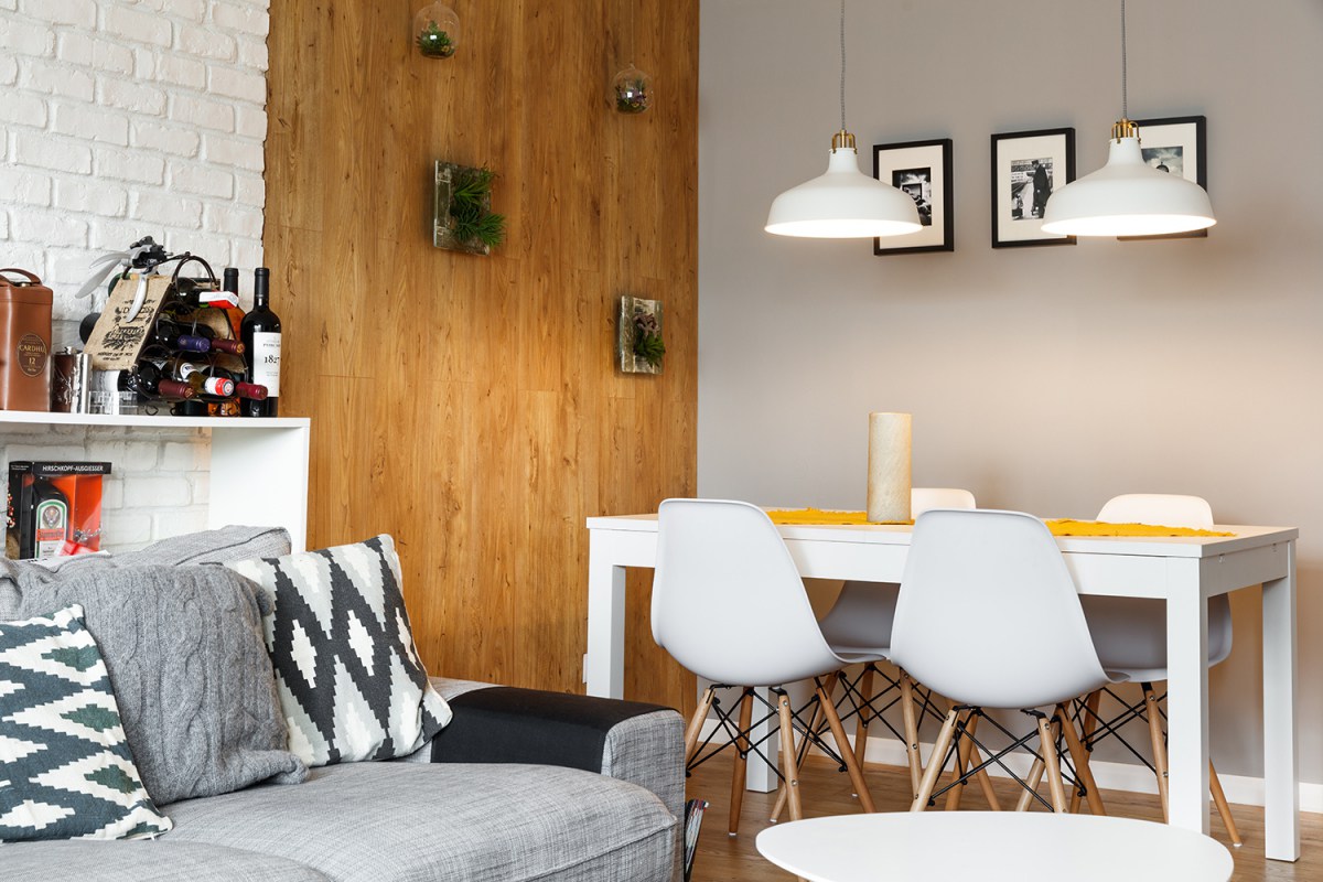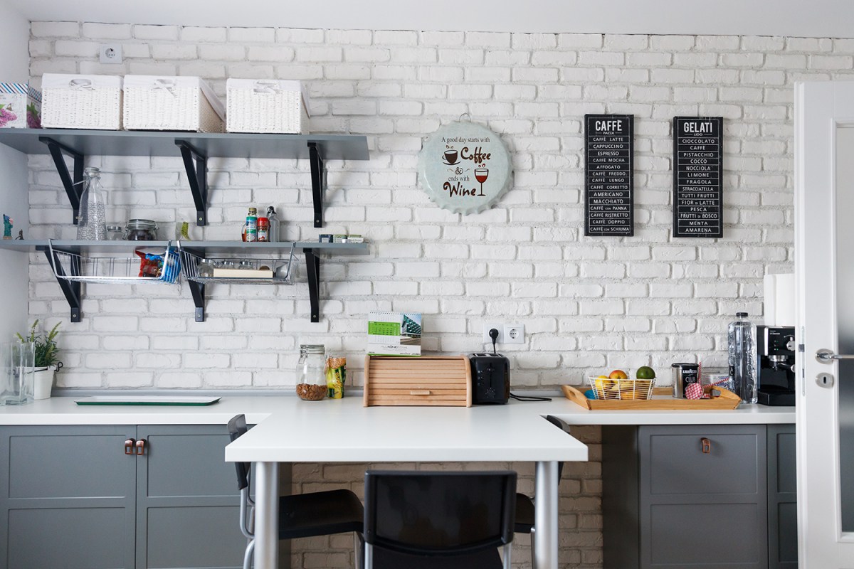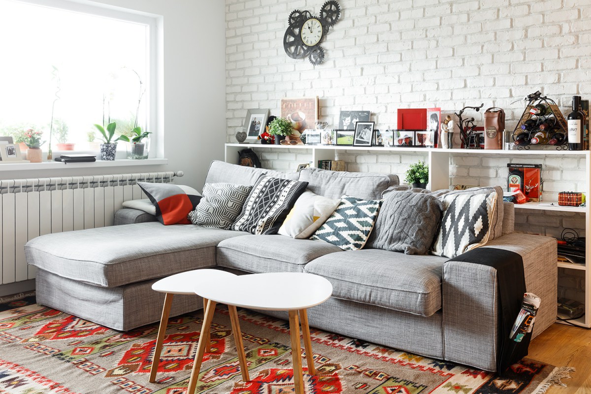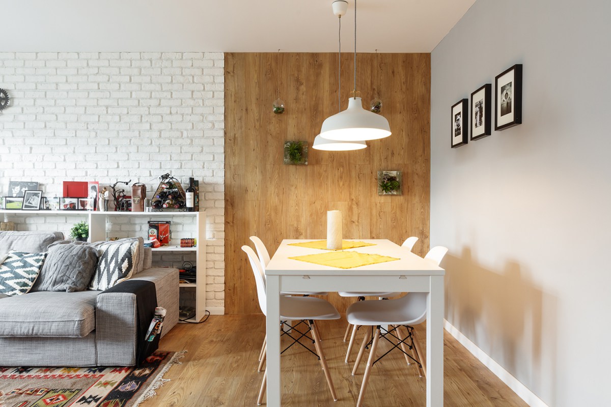 Това е домът на младо семейство, чиято първоначална цел е била да създадат един модерен и цветен апартамент. Тухлената стена е задължителна. За това на лице има тъкмо две – една в хола и една в просторното кухненско пространство.