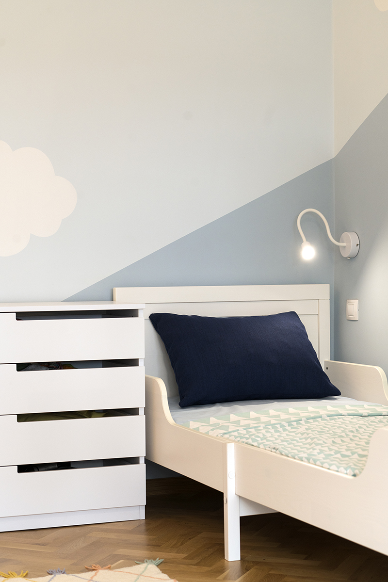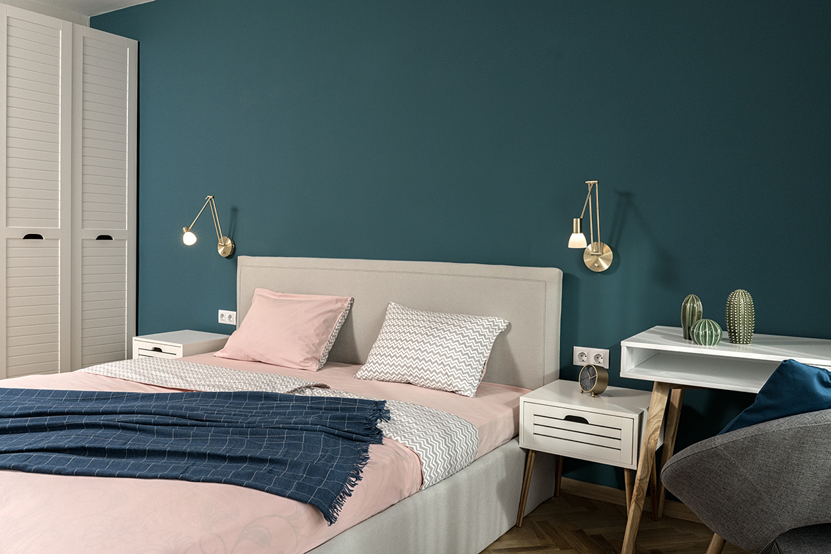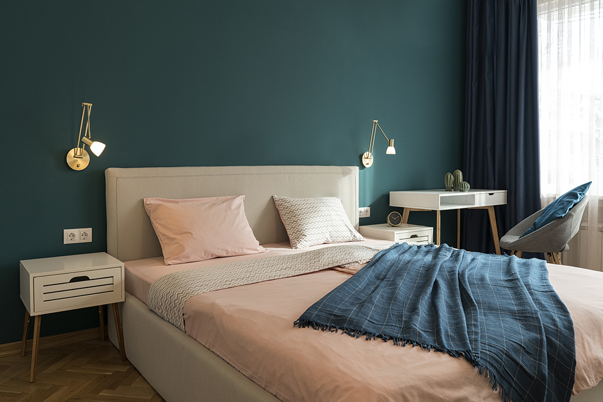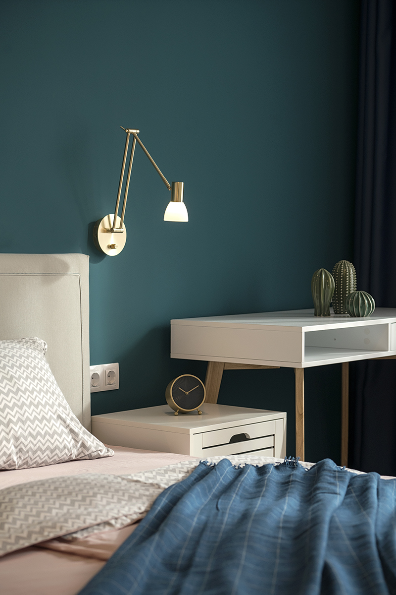 Спалнята на родителите също е скандинавски стил, в който впечатление прави умелата комбинация между белите мебели с изчистени линии и по-наситените изумрудени нюанси на стената, които са вдъхновени от любовта на собствениците към морето. Много добре подбрани са и акцентите в интериорния дизайн на спалнята, а именно месинговите стенни лампи и аксесоари.