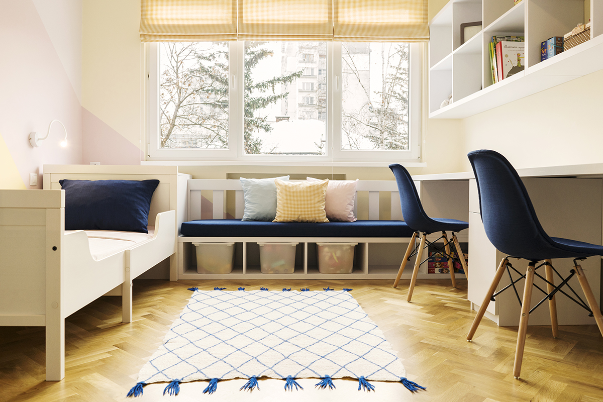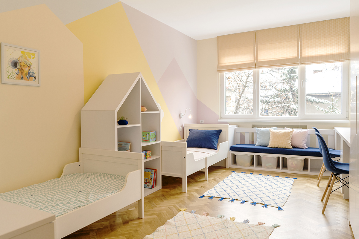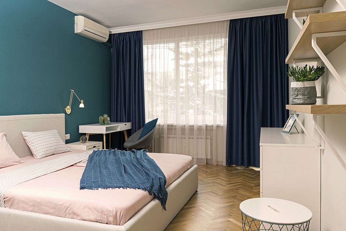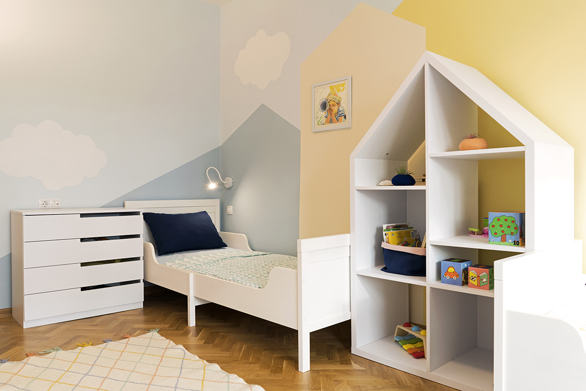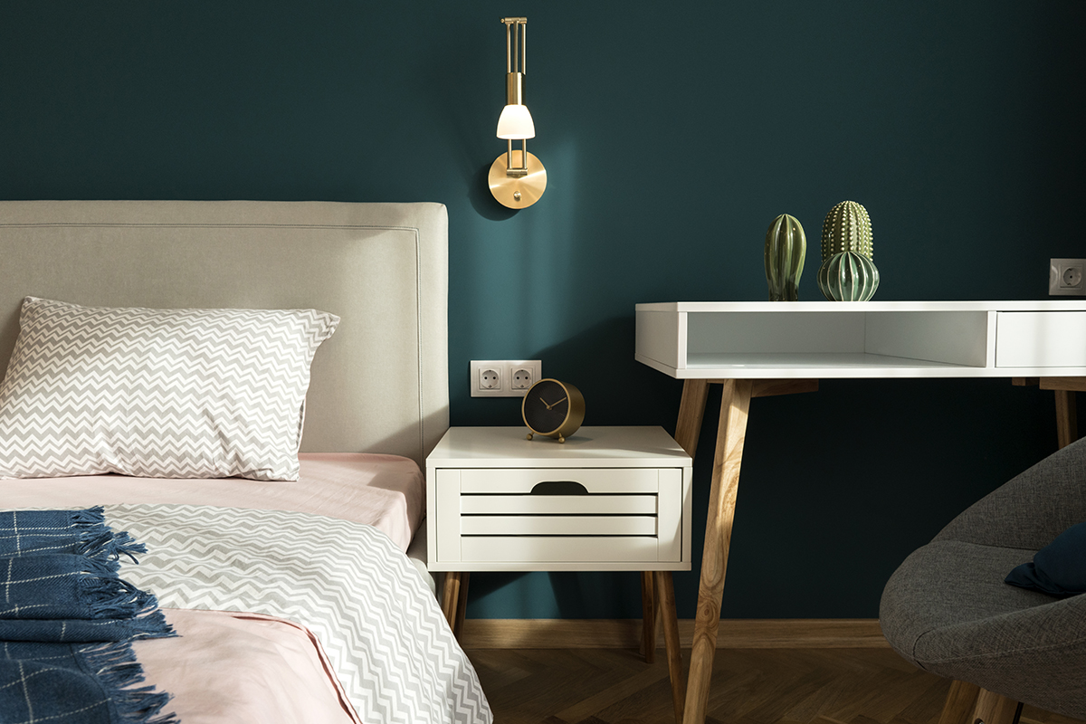Спалнята на родителите също е скандинавски стил, в който впечатление прави умелата комбинация между белите мебели с изчистени линии и по-наситените изумрудени нюанси на стената, които са вдъхновени от любовта на собствениците към морето. Много добре подбрани са и акцентите в интериорния дизайн на спалнята, а именно месинговите стенни лампи и аксесоари.