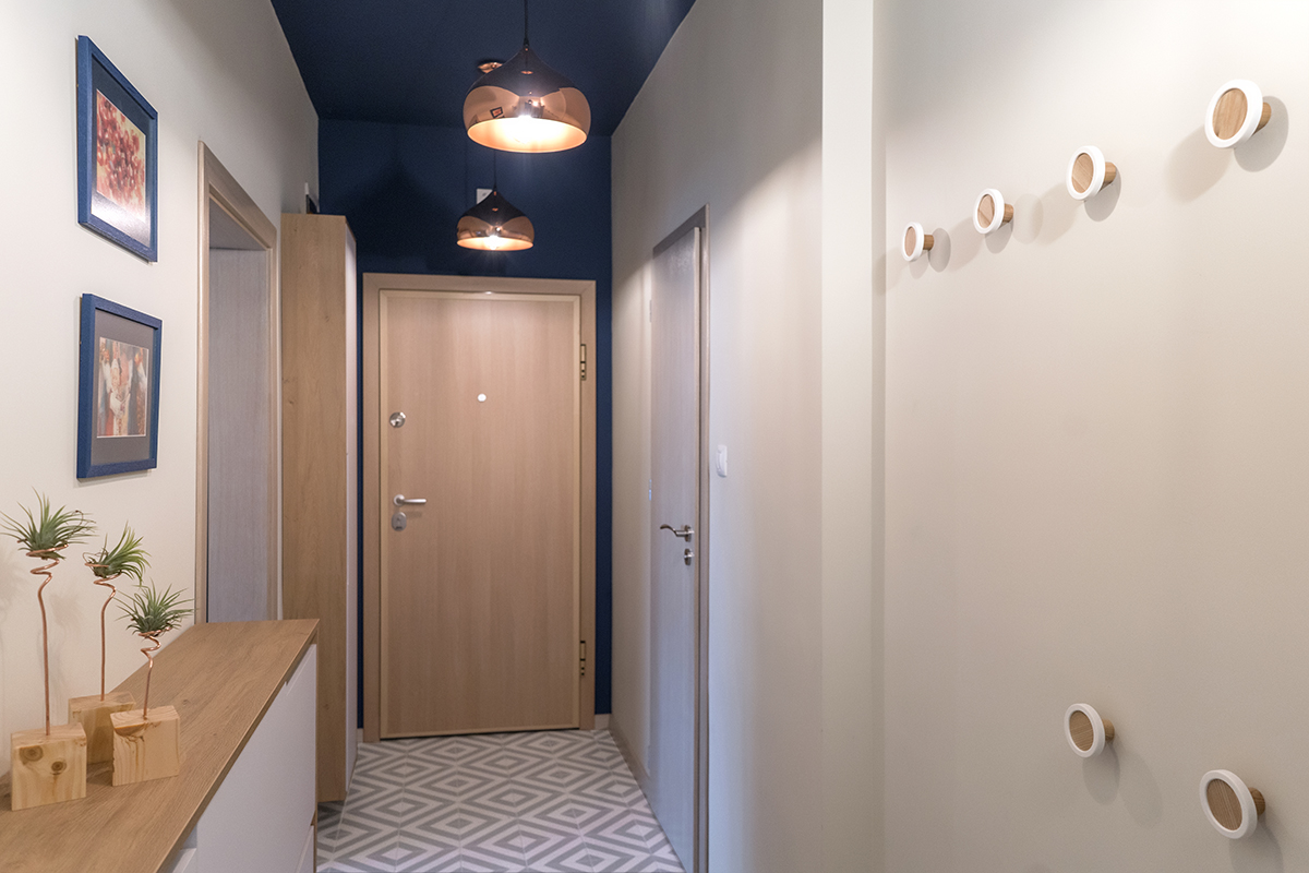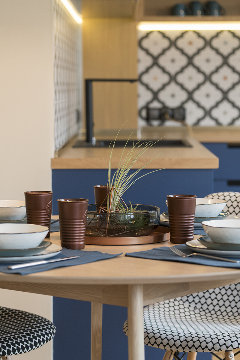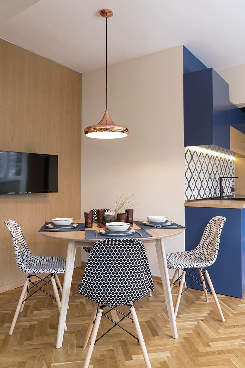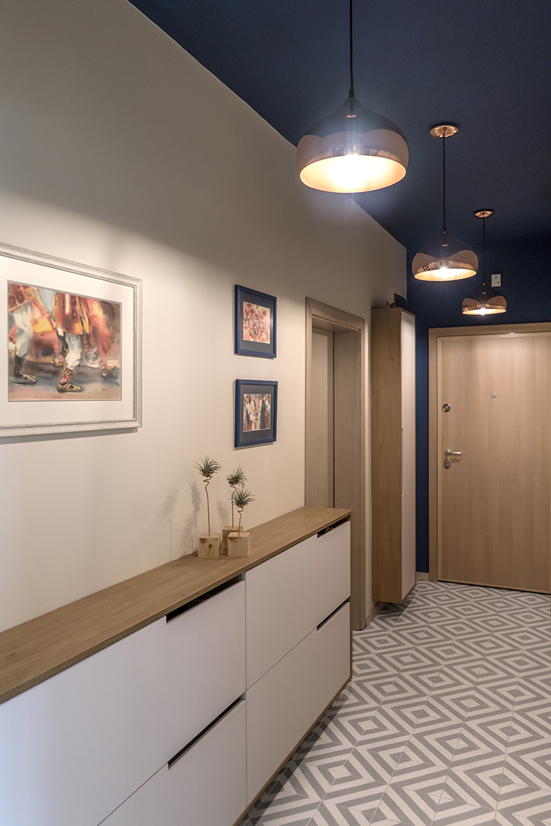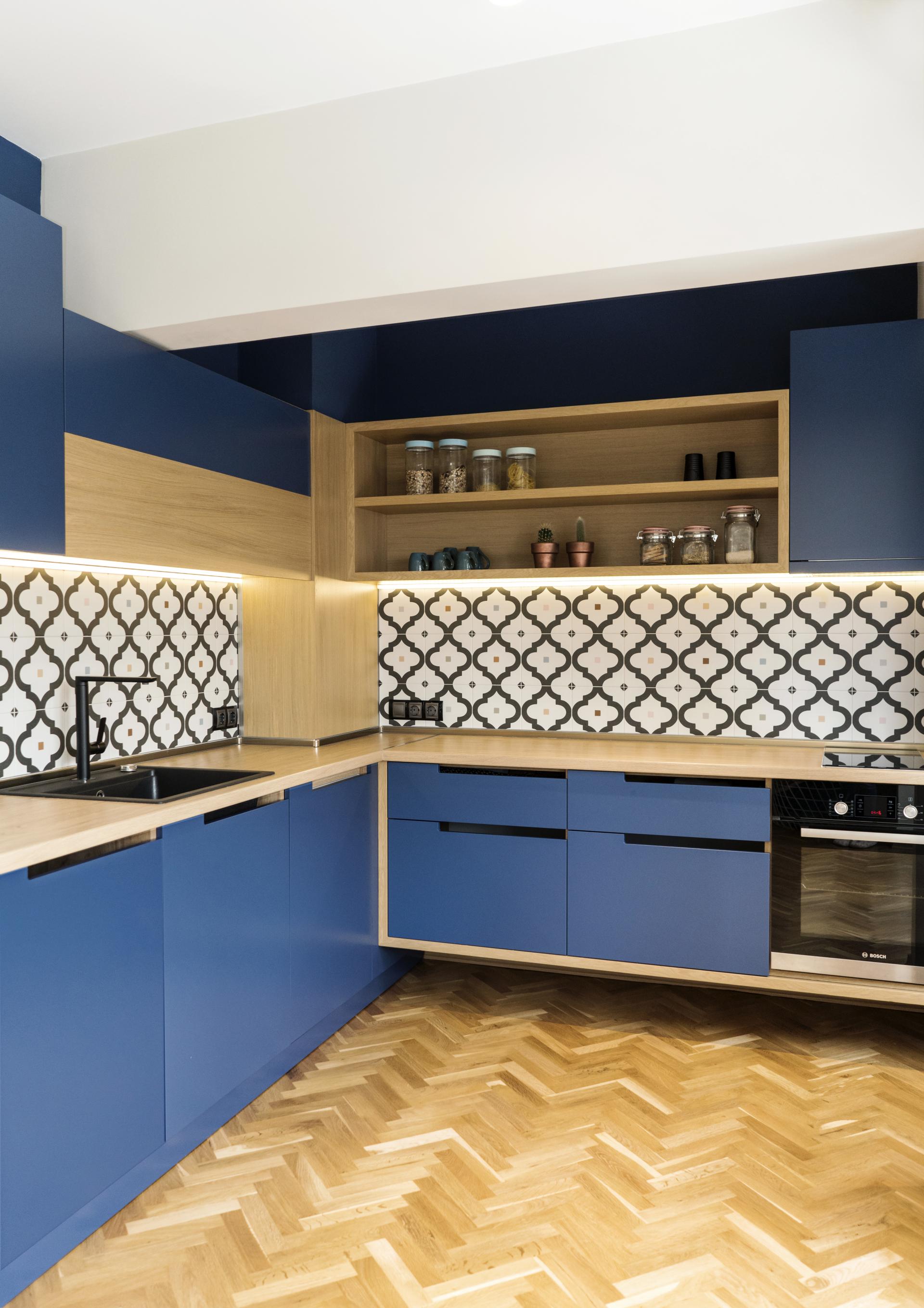 Красивата и функционална кухня е сърцето на всеки дом. Тук цвета на мебелите е в наситено син цвят. Много силен акцент в кухнята са графичните растери в плочките, които плавно преминават и се срещат в текстила на столовете около трапезарната маса, както и в килима и текстила на дневната. Няма как да пропуснем и банята, която безспорно прави впечатление с избора и комбинацията на бели плочки с различни геометрични шарки по тях. Коридорът е другото интересно реализирано пространство, при което е решено стените да бъдат в бяло, а тавана в наситен син цвят. Друг хващащ окото акцент са красивите картини и висящи медни полюлей, които осветяват.