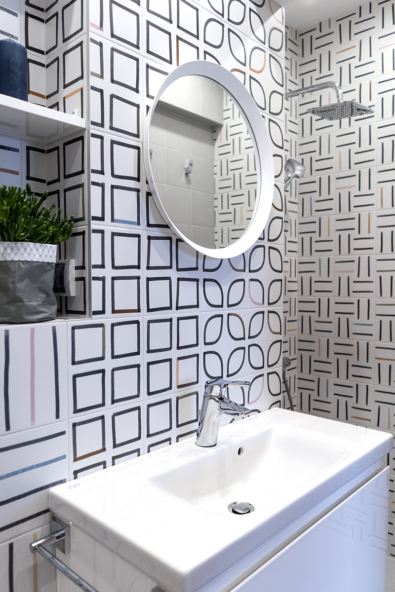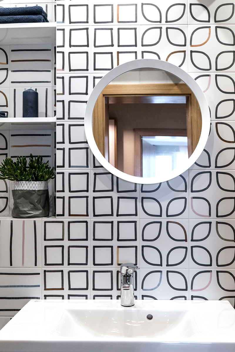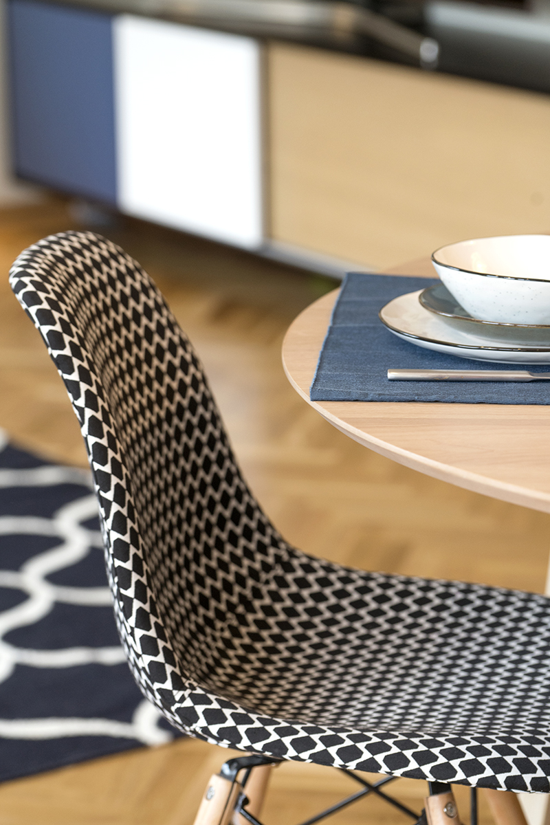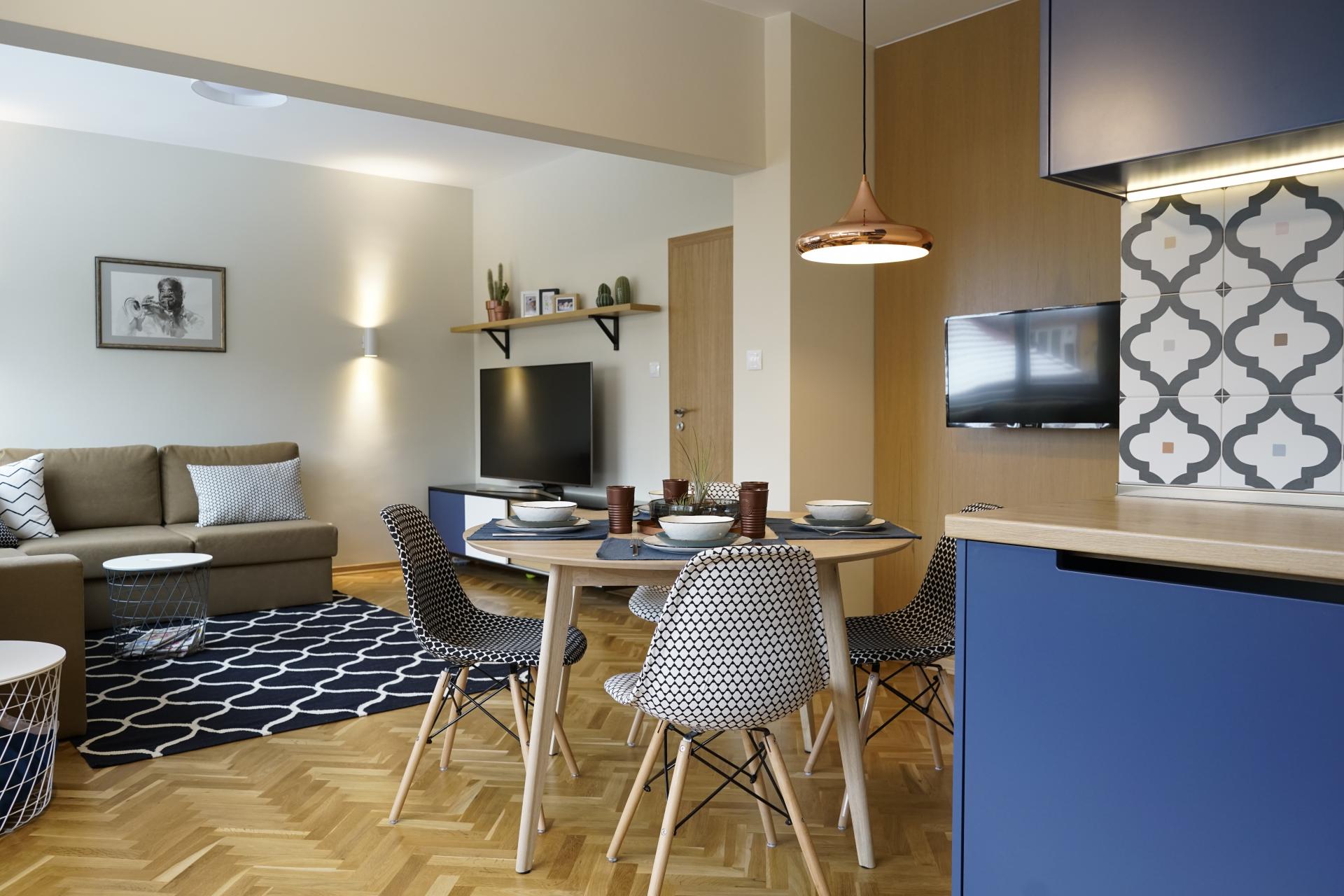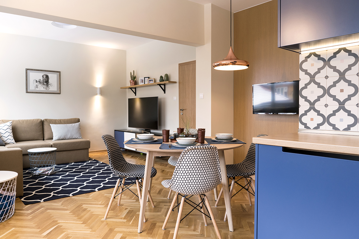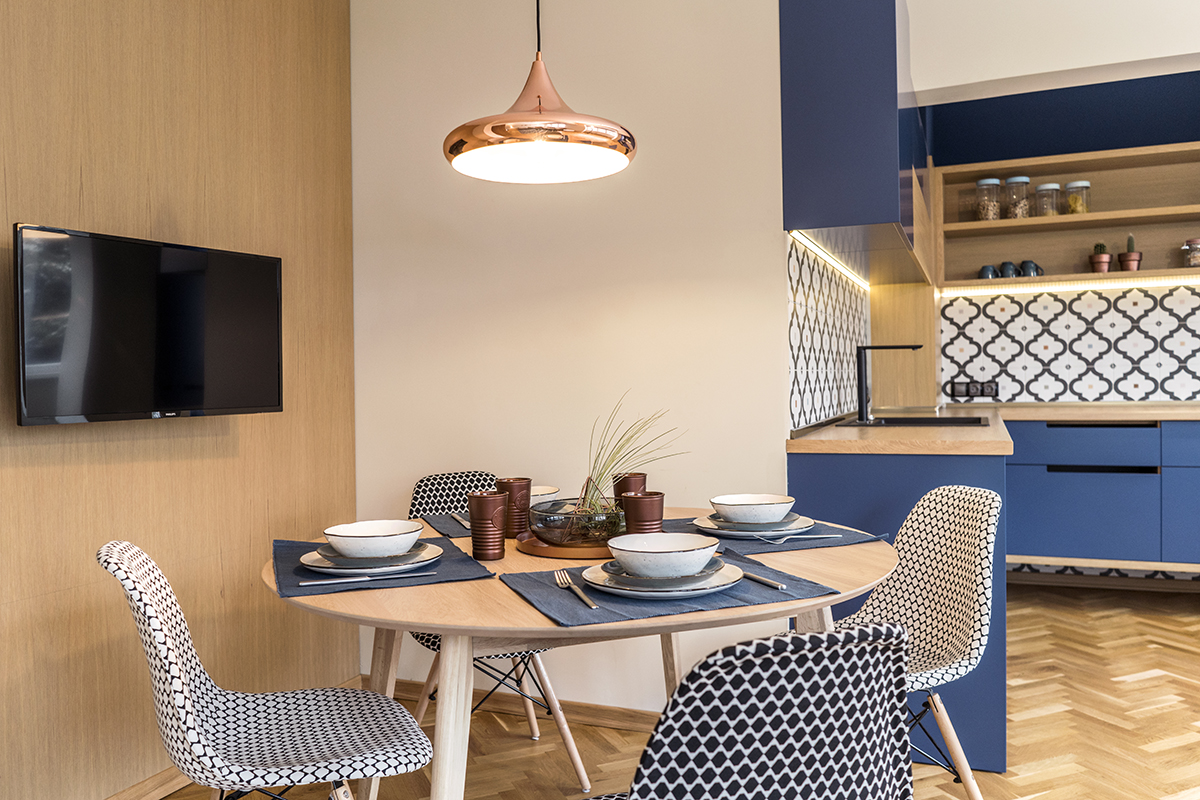 Красивата и функционална кухня е сърцето на всеки дом. Тук цвета на мебелите е в наситено син цвят. Много силен акцент в кухнята са графичните растери в плочките, които плавно преминават и се срещат в текстила на столовете около трапезарната маса, както и в килима и текстила на дневната. Няма как да пропуснем и банята, която безспорно прави впечатление с избора и комбинацията на бели плочки с различни геометрични шарки по тях. Коридорът е другото интересно реализирано пространство, при което е решено стените да бъдат в бяло, а тавана в наситен син цвят. Друг хващащ окото акцент са красивите картини и висящи медни полюлей, които осветяват.