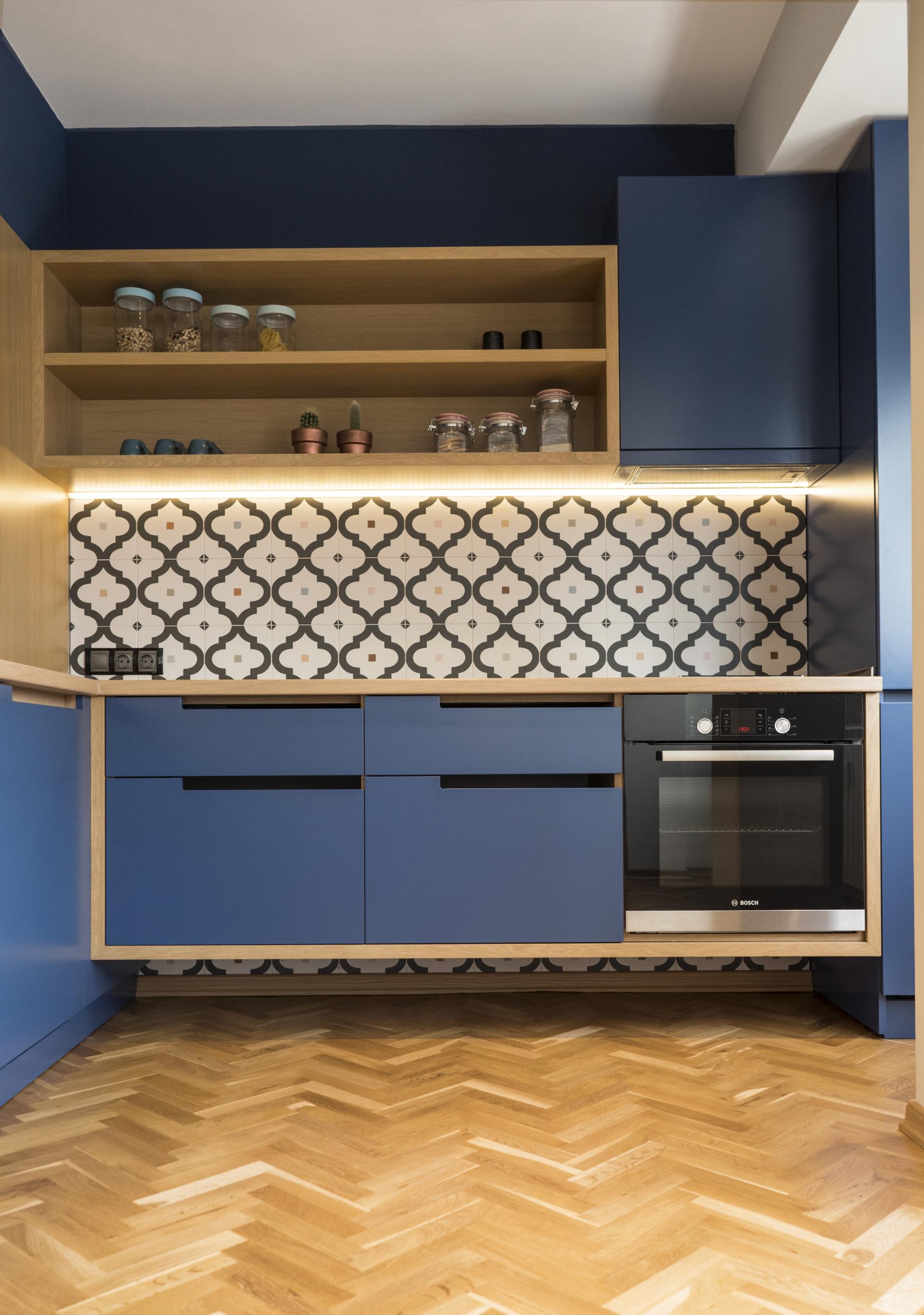 Красивата и функционална кухня е сърцето на всеки дом. Тук цвета на мебелите е в наситено син цвят. Много силен акцент в кухнята са графичните растери в плочките, които плавно преминават и се срещат в текстила на столовете около трапезарната маса, както и в килима и текстила на дневната. Няма как да пропуснем и банята, която безспорно прави впечатление с избора и комбинацията на бели плочки с различни геометрични шарки по тях. Коридорът е другото интересно реализирано пространство, при което е решено стените да бъдат в бяло, а тавана в наситен син цвят. Друг хващащ окото акцент са красивите картини и висящи медни полюлей, които осветяват.