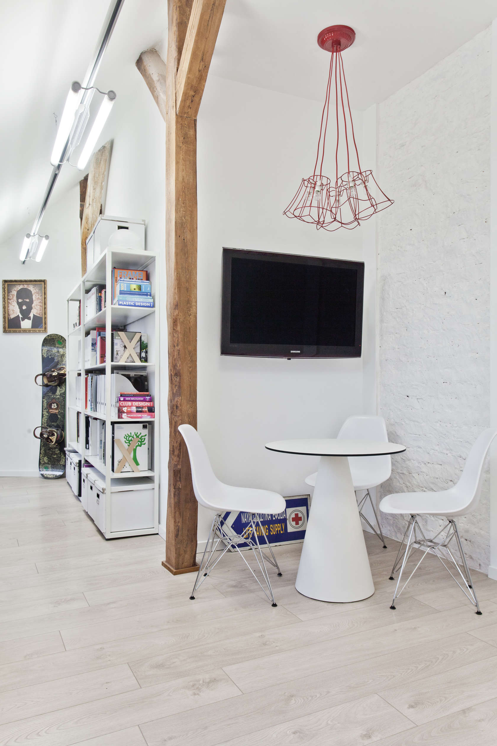 Белият цвят на пространството, лесното смесване на леки цветни тонове с дървените подове, кара този мансарден апартамент да изглежда по-голям. Контрастното естествено дърво създава уникален ефект. Повечето от мебелите са съвсем семпли като в цвят и форма и се използва същото дърво и бяла палитра.