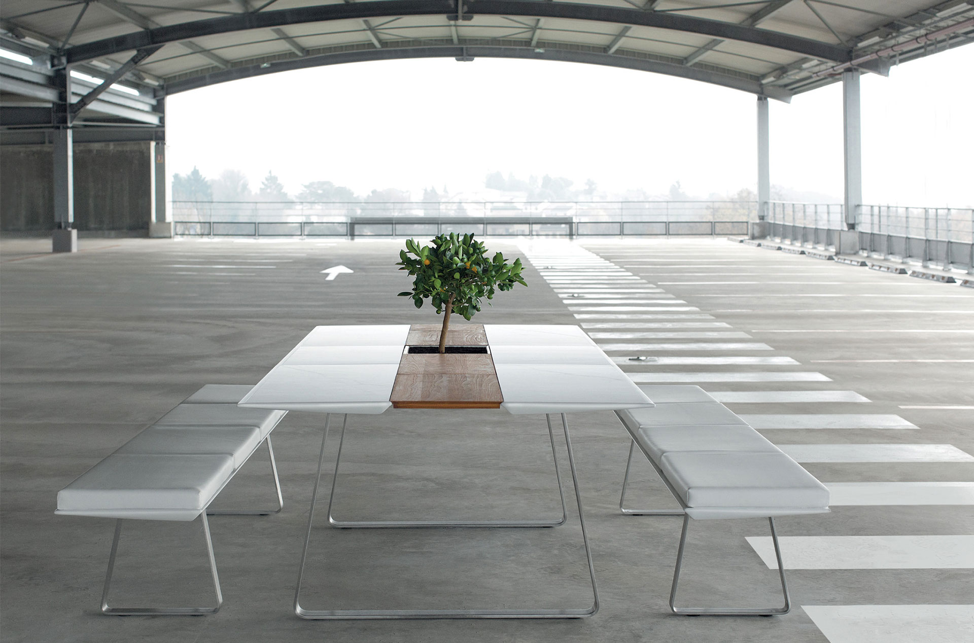 Структурата и основата са изработени от подсилен алуминий, огънат и оформен в здрави крака с гладка кривина в краищата, за да придаде на модулната маса за хранене малко закръгленост.