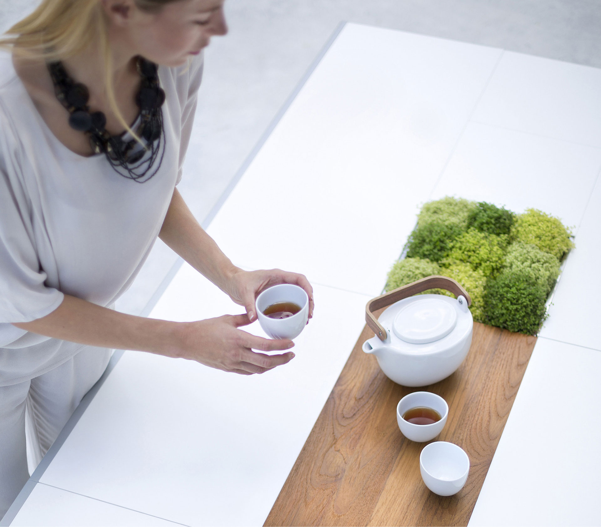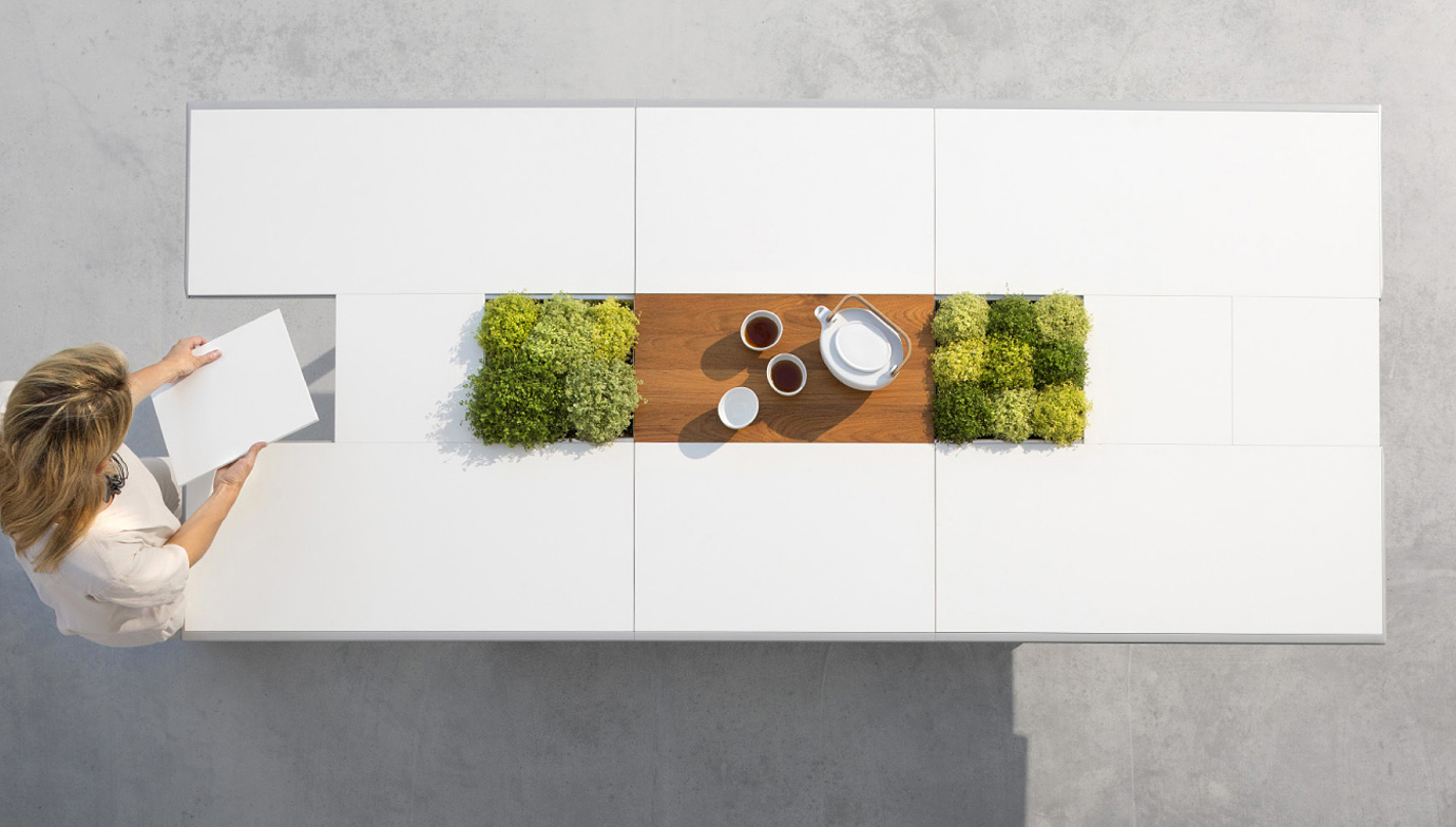 Това, което наистина поставя тази модулна маса пред всички останали и я отличава от другите са единствените по рода си особености и функции, като адаптивни маса бегач. Можете да запълните центъра или частично да го отстраните, за да се разкрие едно отворено пространство, в които човек може да постави растения, чинии или други части от декора.
