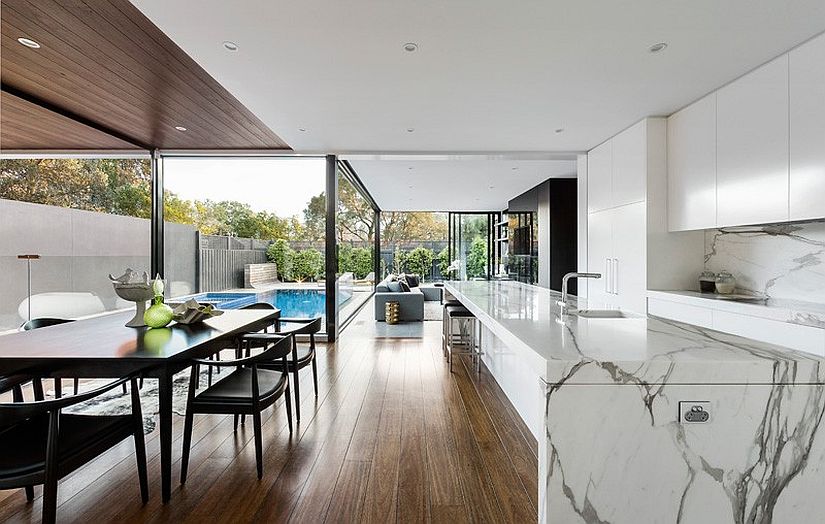 Нека влезем вътре! Кухнята има невероятен дизайн в бяло, с блестящ мраморен кухненски остров, изпълняващ ролята и на маса за закуска. Точно до нея е малка зона за хранене. След това има стъклена част, където е направен кът за сядане и релаксация. Структурата има изглед към басейна и задния двор.