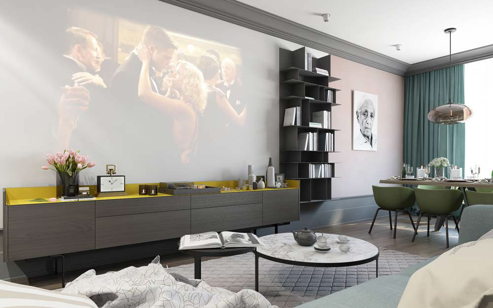 Да, в дневната липсва телевизор, но за сметка на това бялата стена се използва за прожектиране на филми. Осветлението в дневната и кухнята е фокусен елемент. Осветителните тела създават една позитивна атмосфера в този дом. Изключително креативно решение!