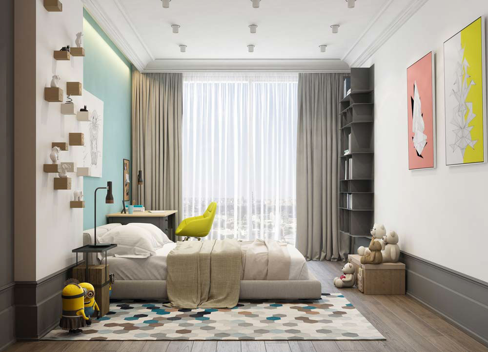 Сега за детската стая – жизнерадностно пространство, украсено с микс от ярки пастели и жълти акценти. Забавни геометрични теми се появяват в килима.