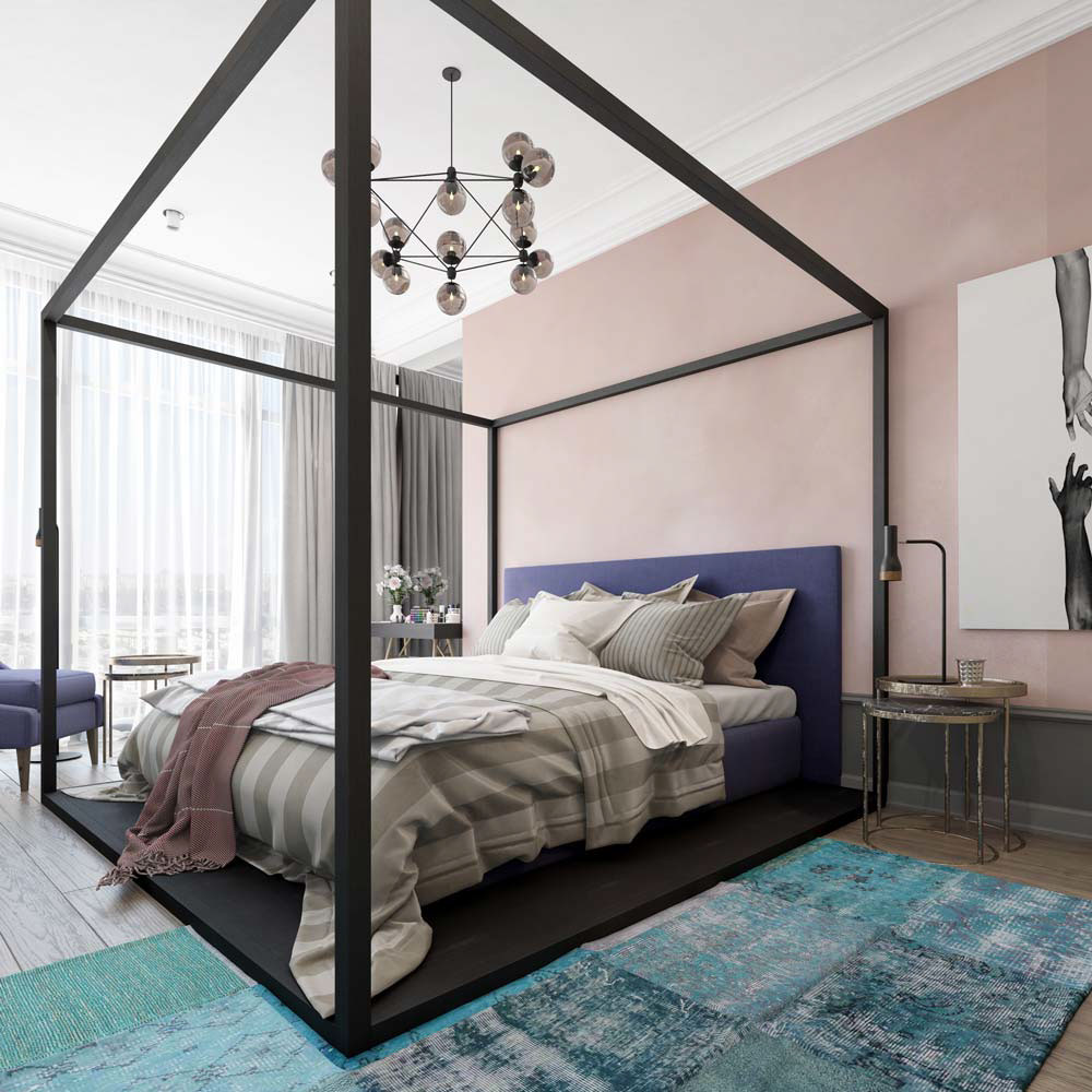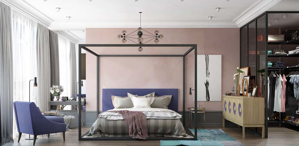 Модерна и релаксираща – главната спалня варира в спектъра от синьо до лилава лавандула. Спалнята е харизматична и уютна.