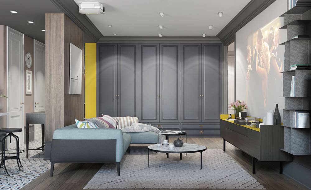 Този прекрасен апартамент с площ от 110 квадратни метра е дело на архитект Иван Юнаков и се състои от полу-отворена всекидневна и кухня, с две самостоятелни спални, достъпни през коридора. Жилищните площи разполагат с ярки естествени цветове – синьо, жълто, маслинено зелено, а само намек и лилав – на фона на лъскаво дърво и светло сива боя.