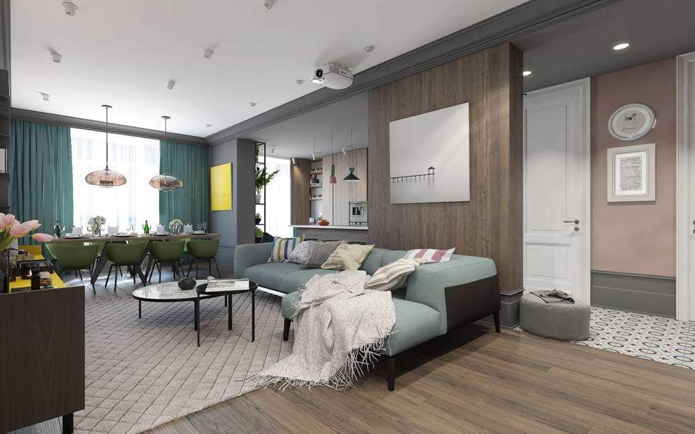 Колоритният интериор е по-скоро еклектичен, отколкото минималистичен. Забележете как акцентите в трапезарията и дневната използват силно наситени цветове, докато дивана и коридора са с меки пастелни тонове за по-релаксиращ вид.
