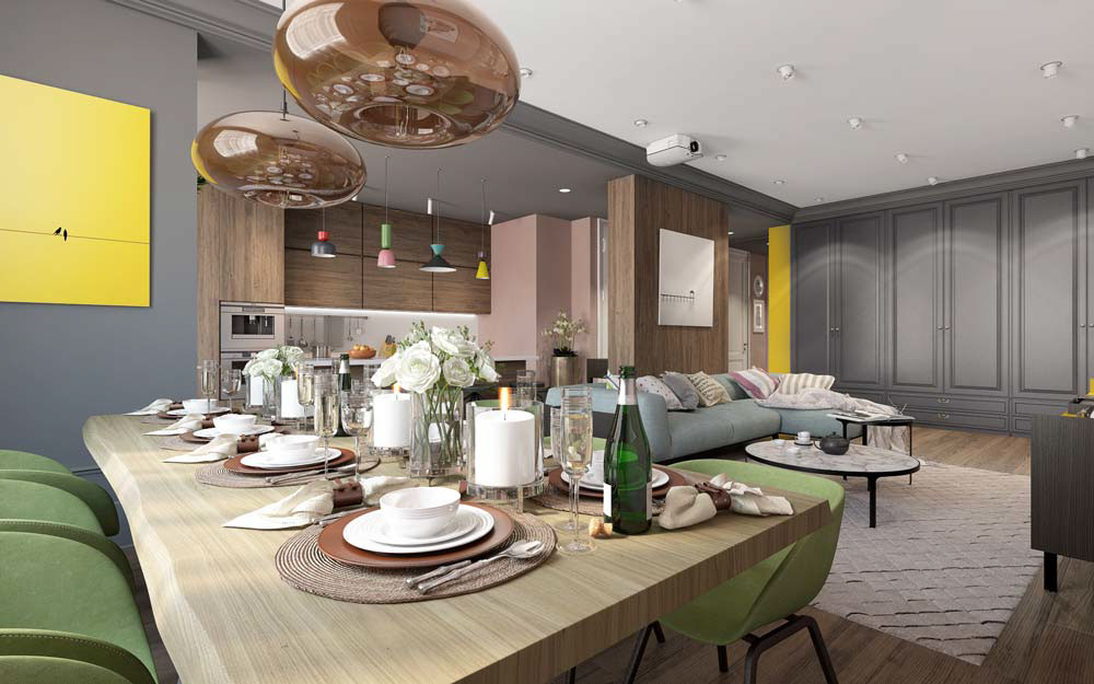 Някои цветoви теми са обичани класики, а други – имат по-авантюристичен вид. Тези две жилища разполагат с творчески палитри – закачлива комбинация от ярки цветни акценти. Смесват се няколко прекрасни пастелни цветове. Тъмните сиви тонове и естествено дърво осигуряват неутрален фон, за да се помогне на тези цветове да се откроят с енергия и ентусиазъм.