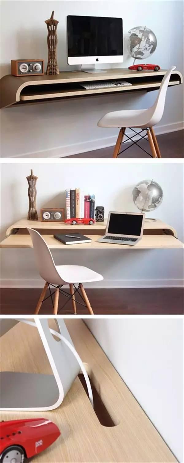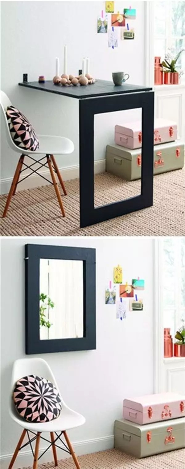 Това са няколко примера за бюра, спестяващи място. Те са всъщност сгъваеми настолни масички, които могат да се превърнат във функционални бюра, когато е нужно. Това е сравнително лесно изпълнима идея, която е перфектна за малки помещения.